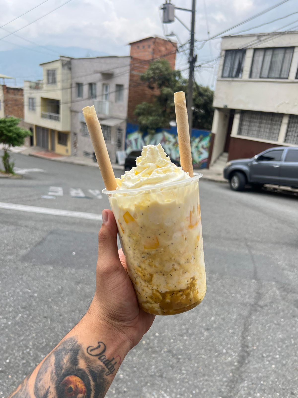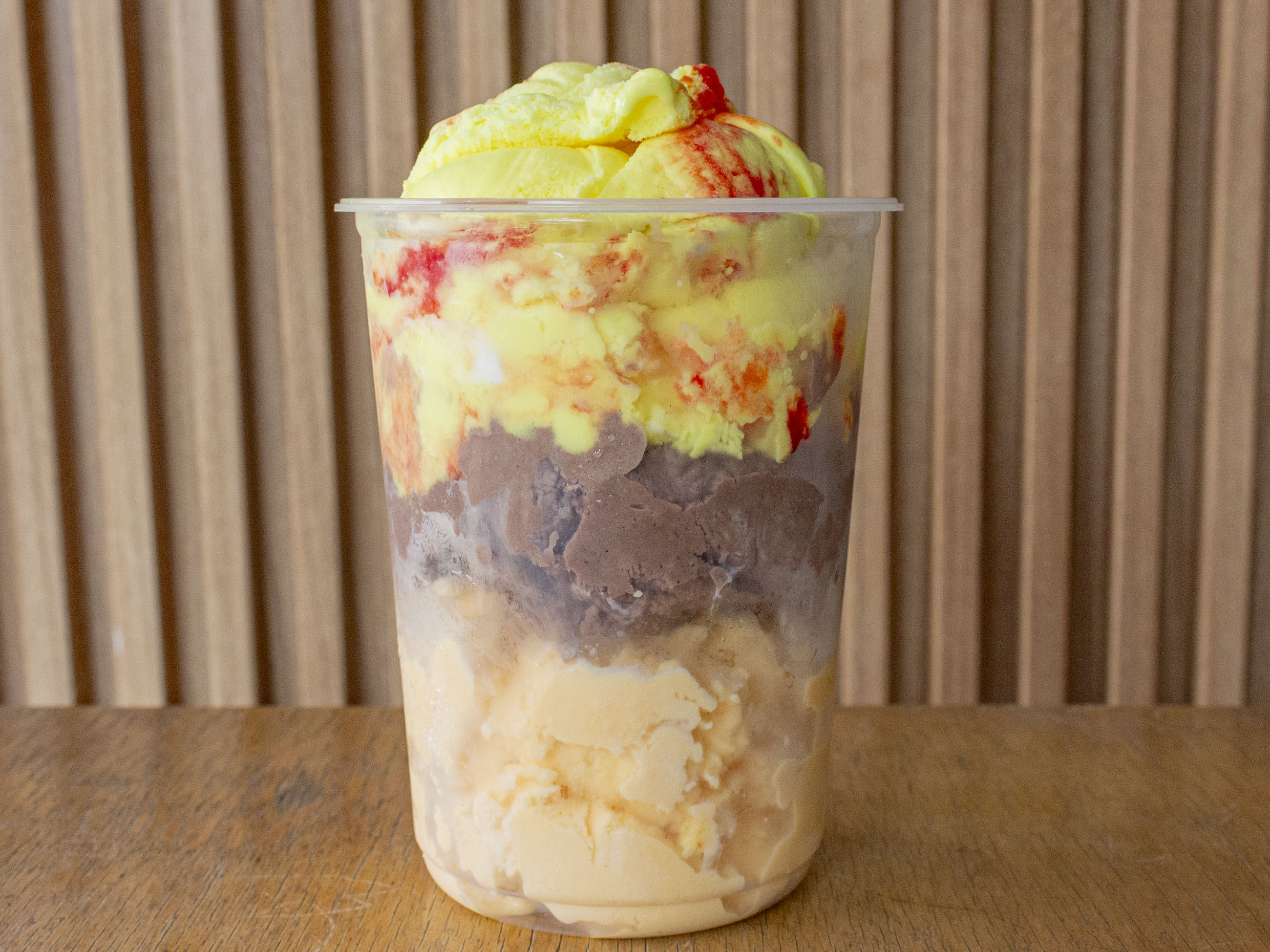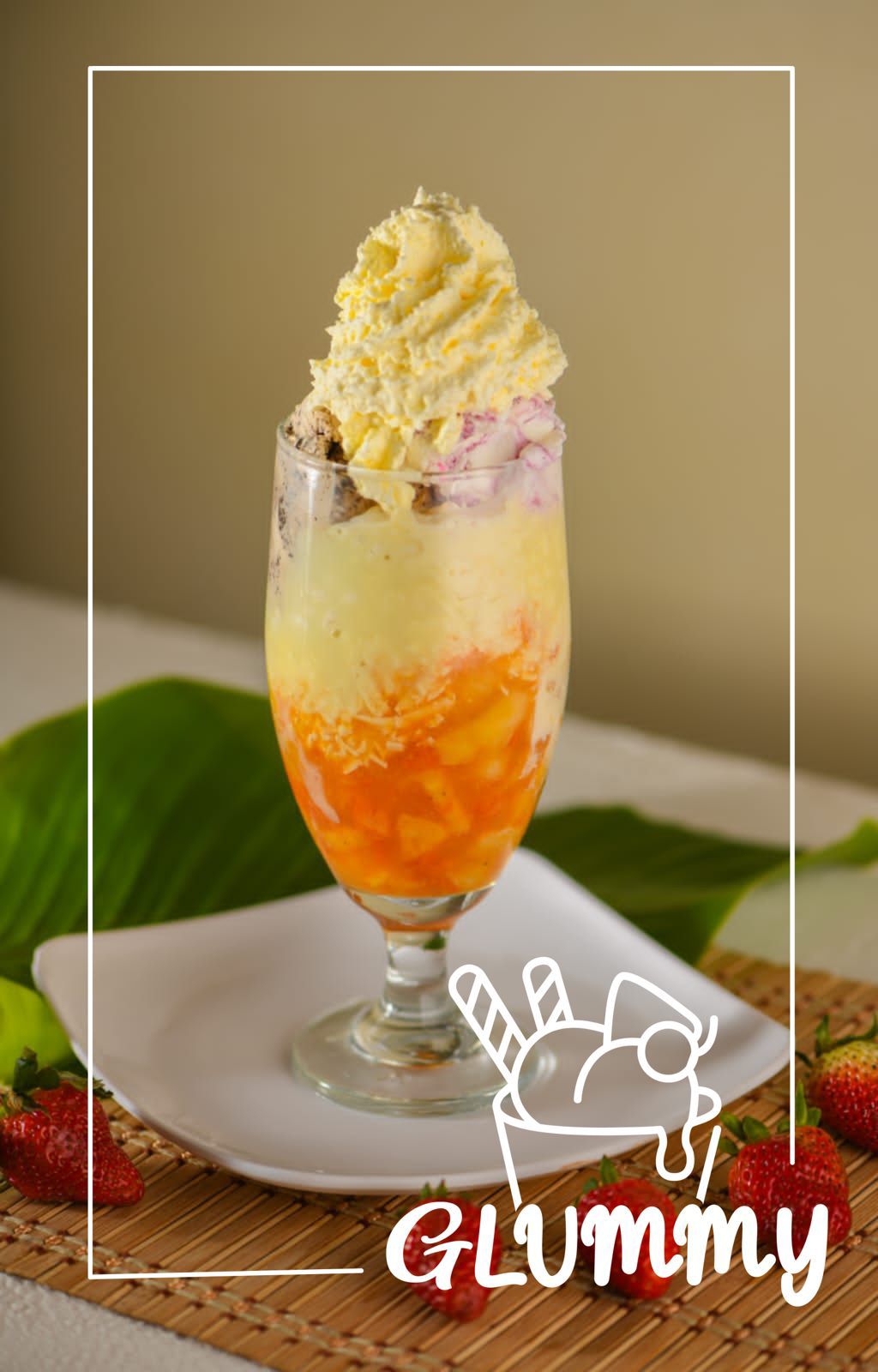 Tres bolas de helado, crema de leche, mermelada de maracuyá, doble trozos de fruta, doble queso, lechera y chantillí.