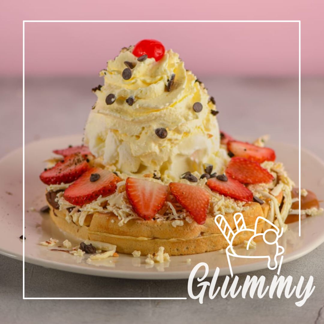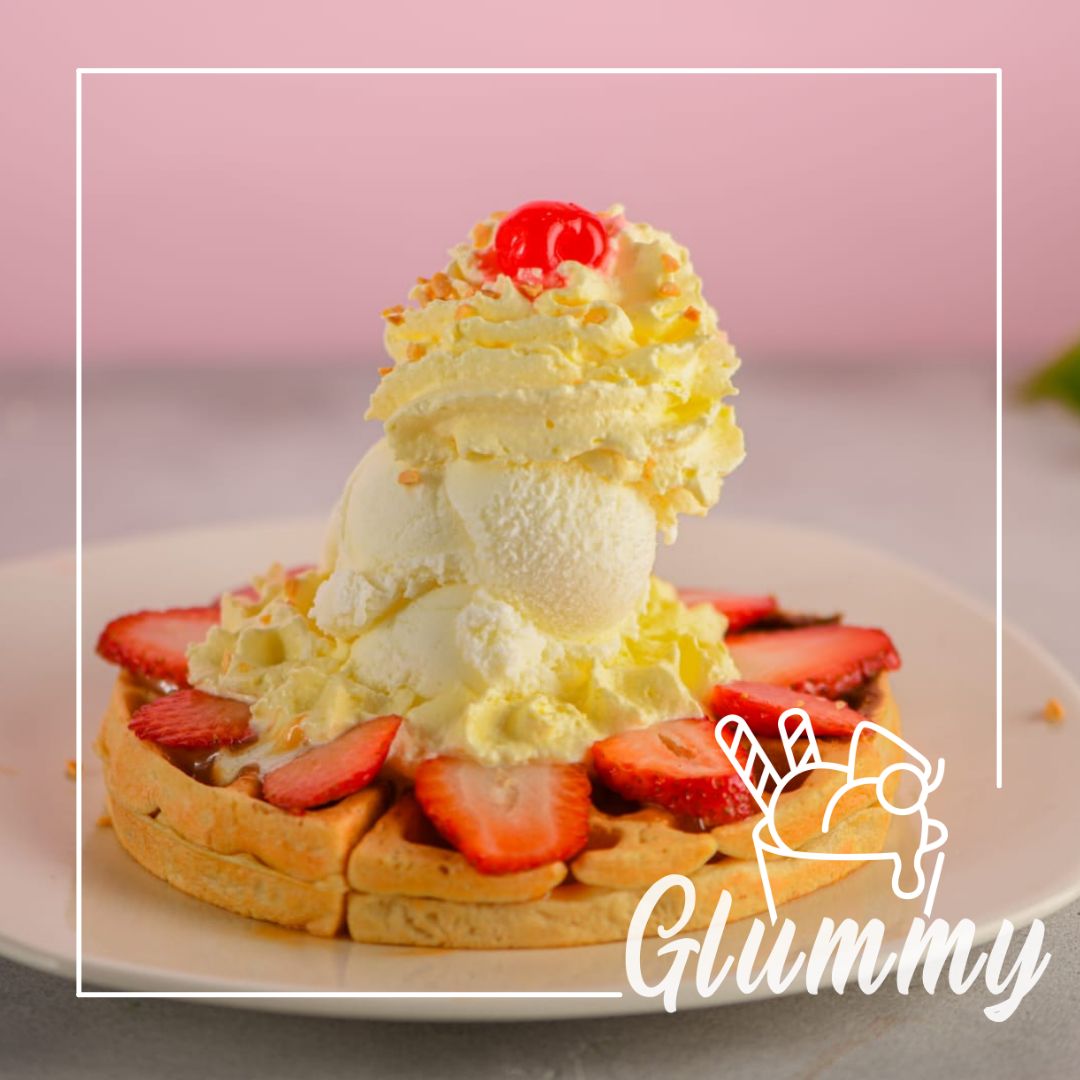 Waffle, salsa, fruta, chantillí, una bola de helado, una cereza y topping.