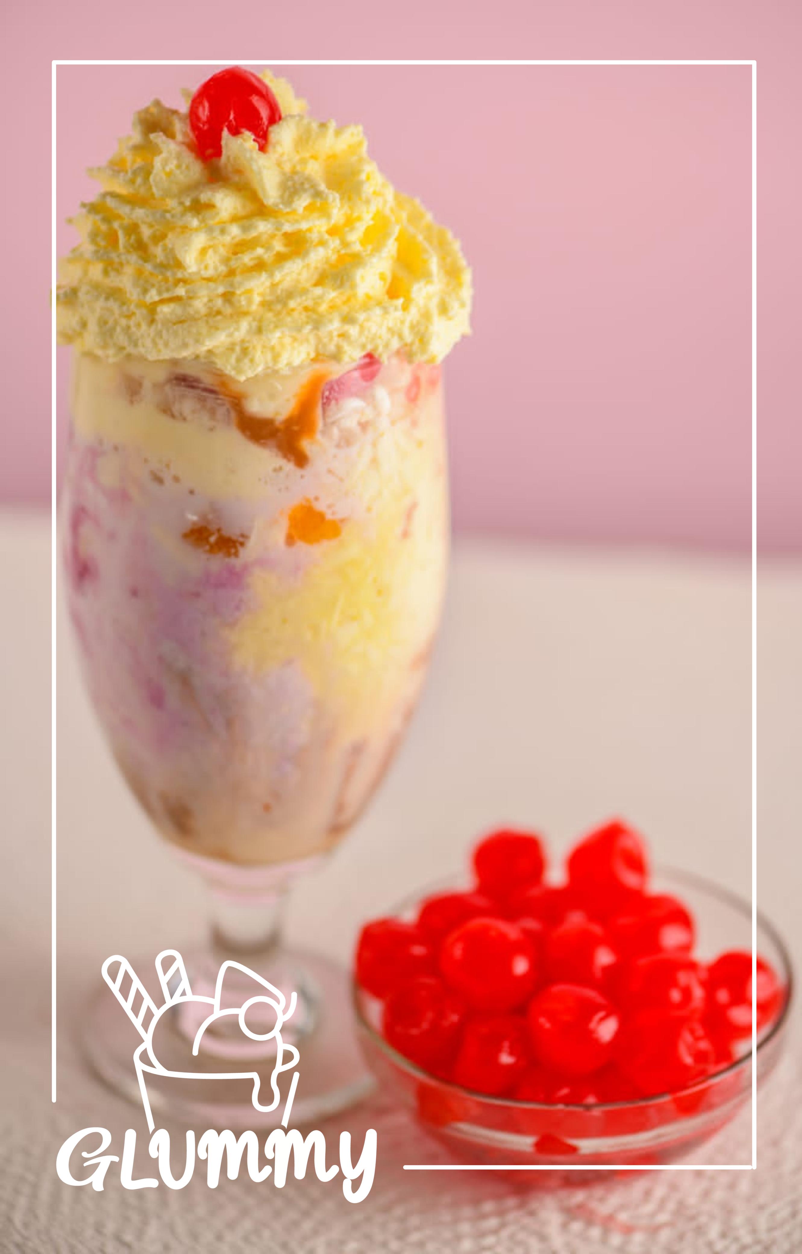 Dos bolas de helado, gelatina, lechera, leche en polvo y cerezas.