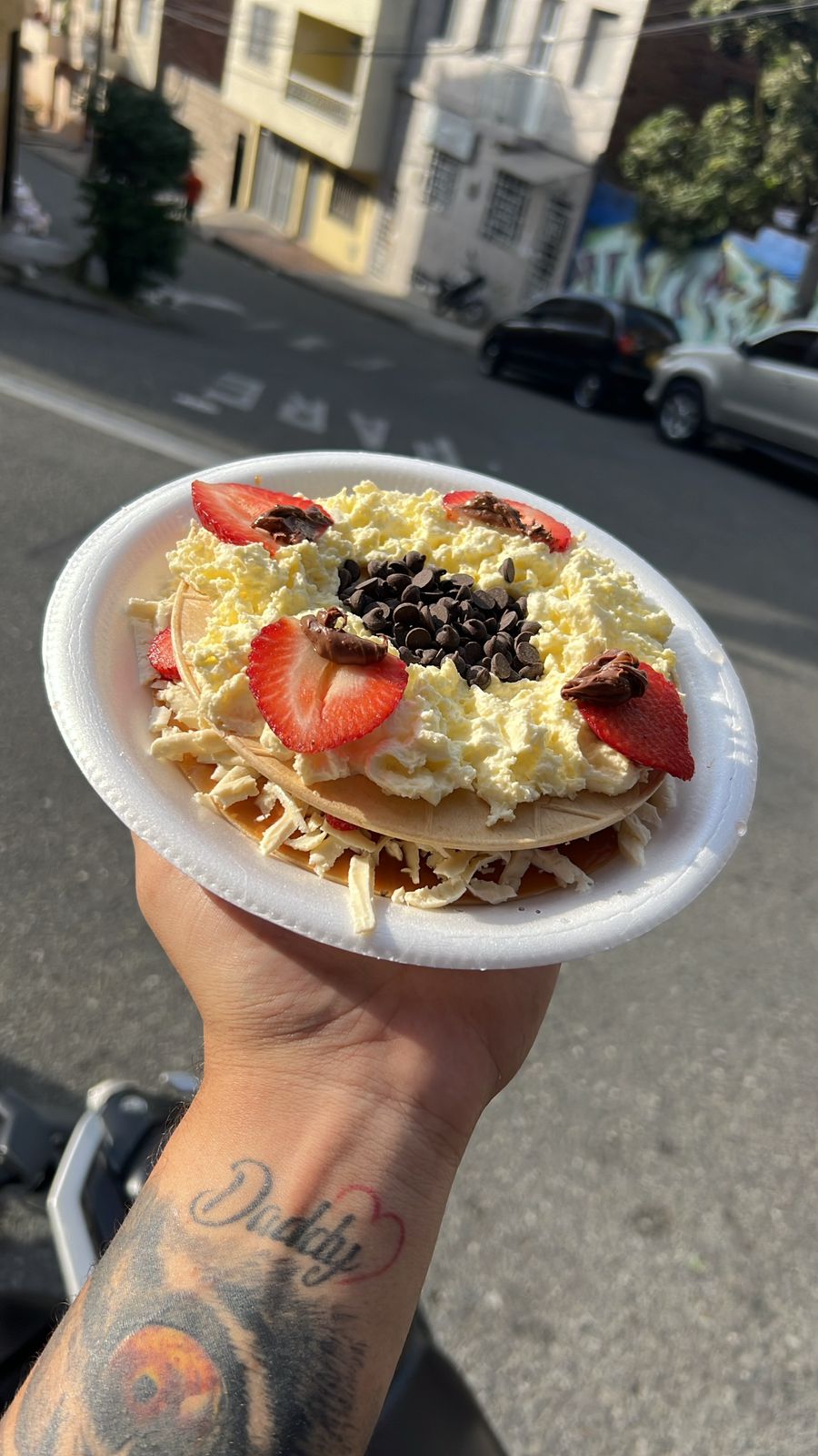 Oblea, arequipe, nutella, chantillí, fresa, chips de chocolate y queso.