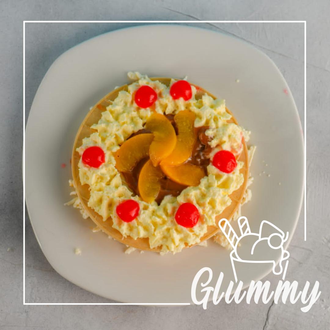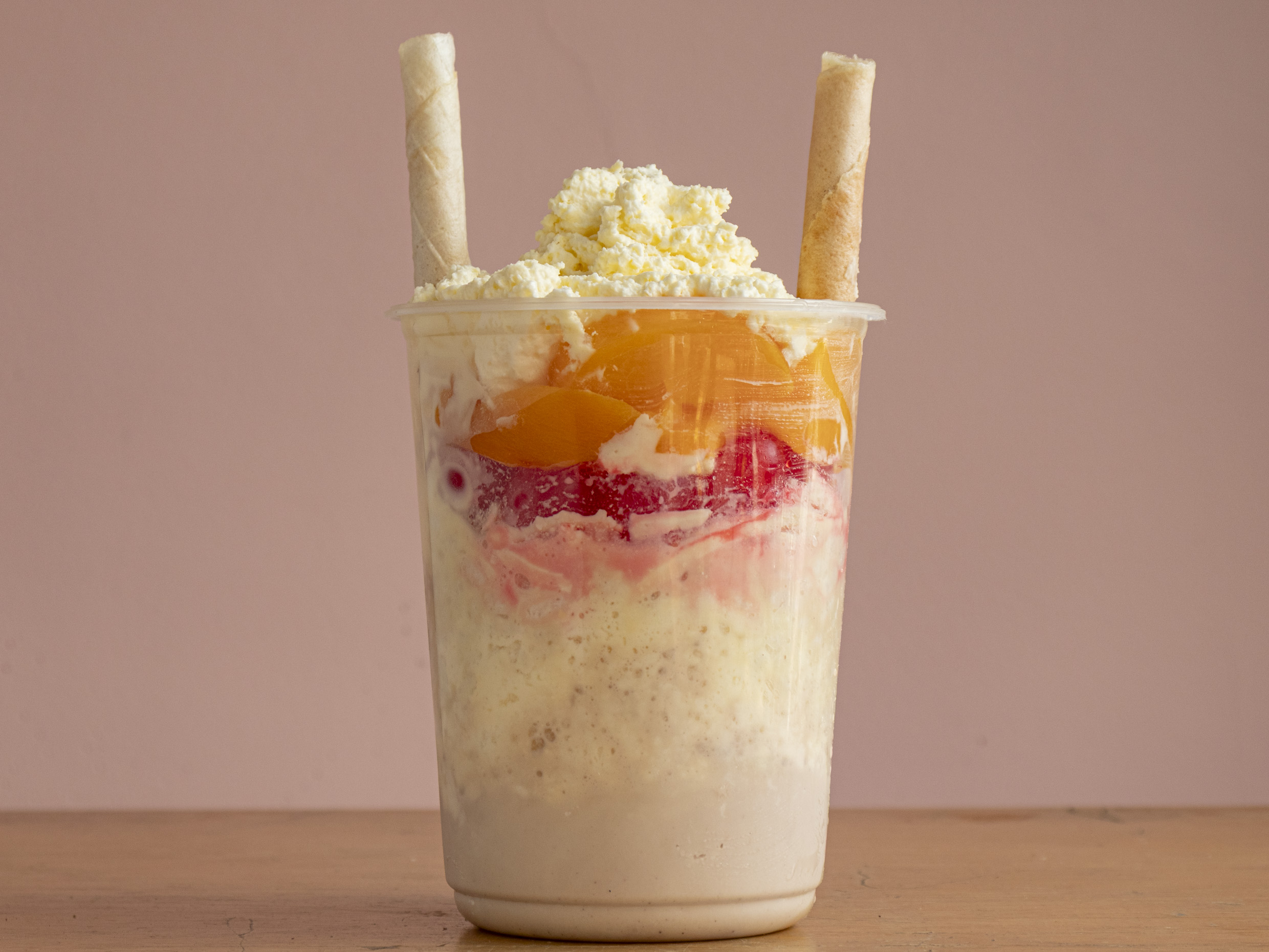 Oblea, durazno, cereza, arequipe, queso y chantillí.