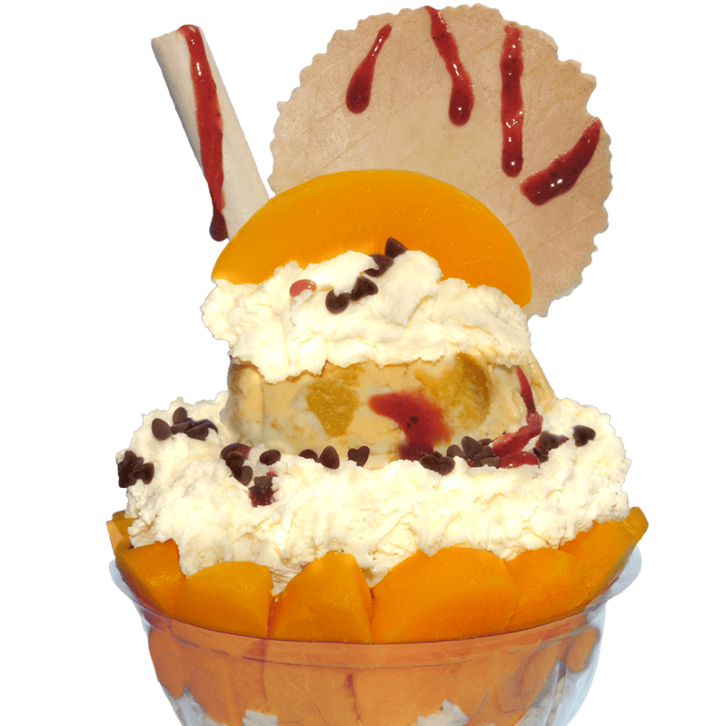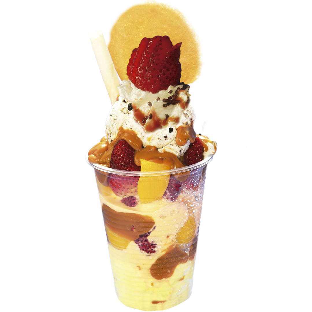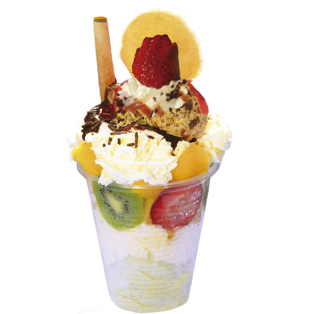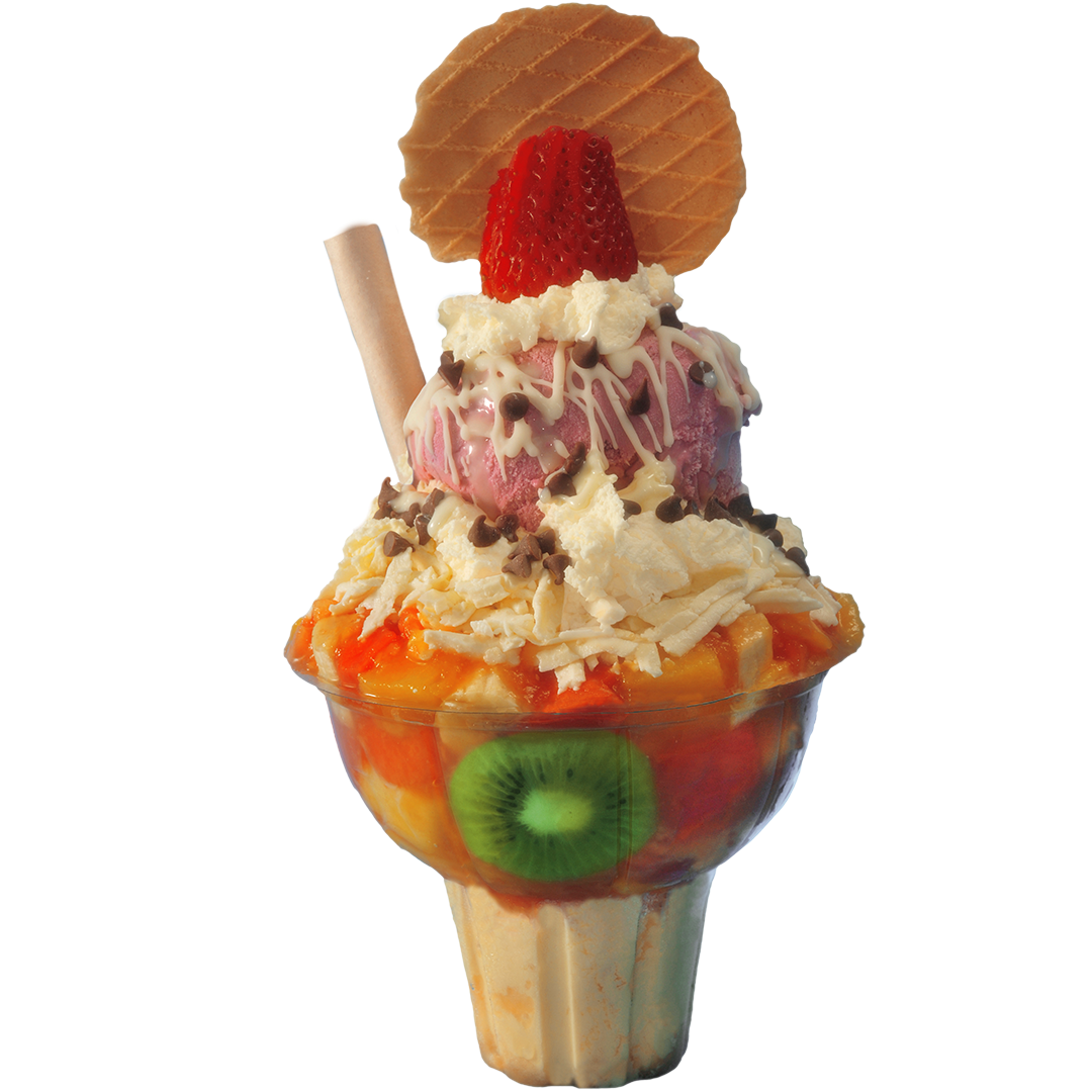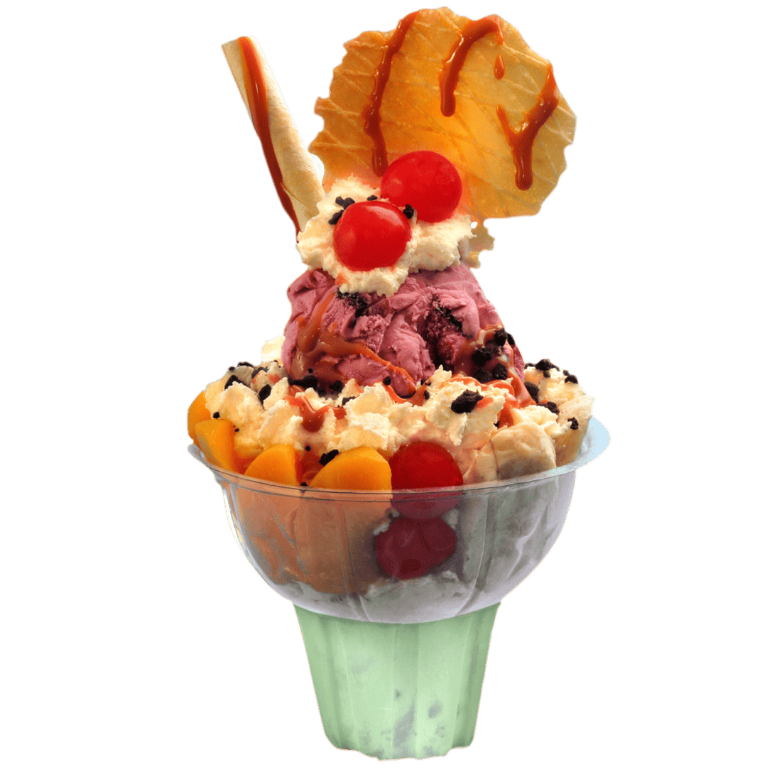 Un sabor de helado con fruta finamente picada Mango, Papaya, Fresa, Banano, Uva, Kiwi, Melocotón, Cereza, Queso, Chantilly, barquillo, Oblea, Salsa, Aderezo.