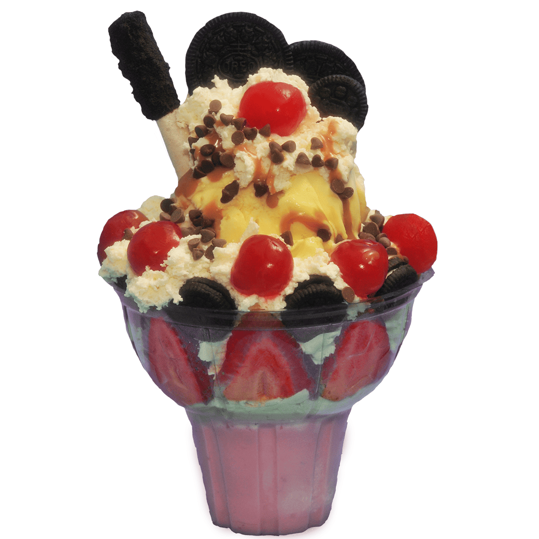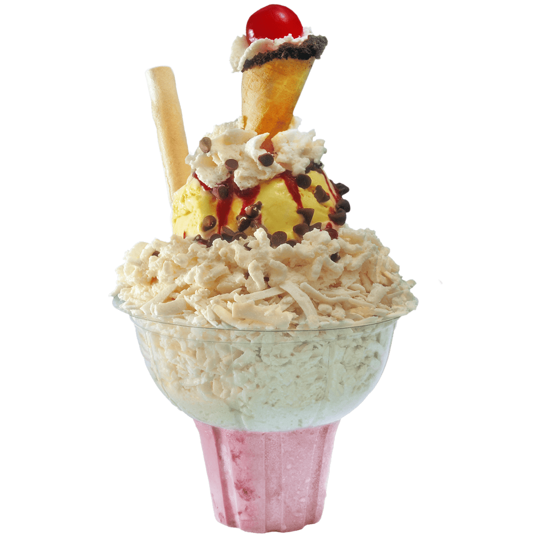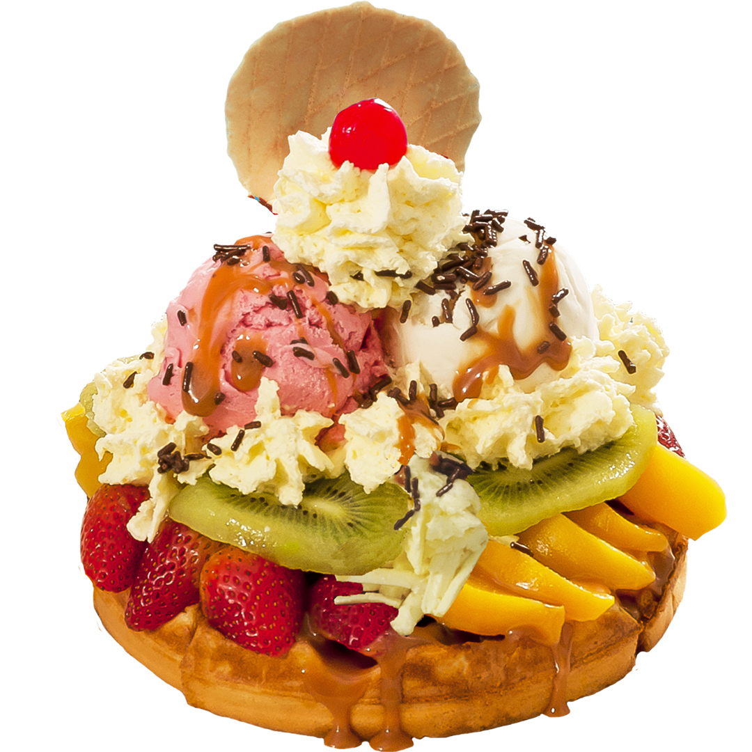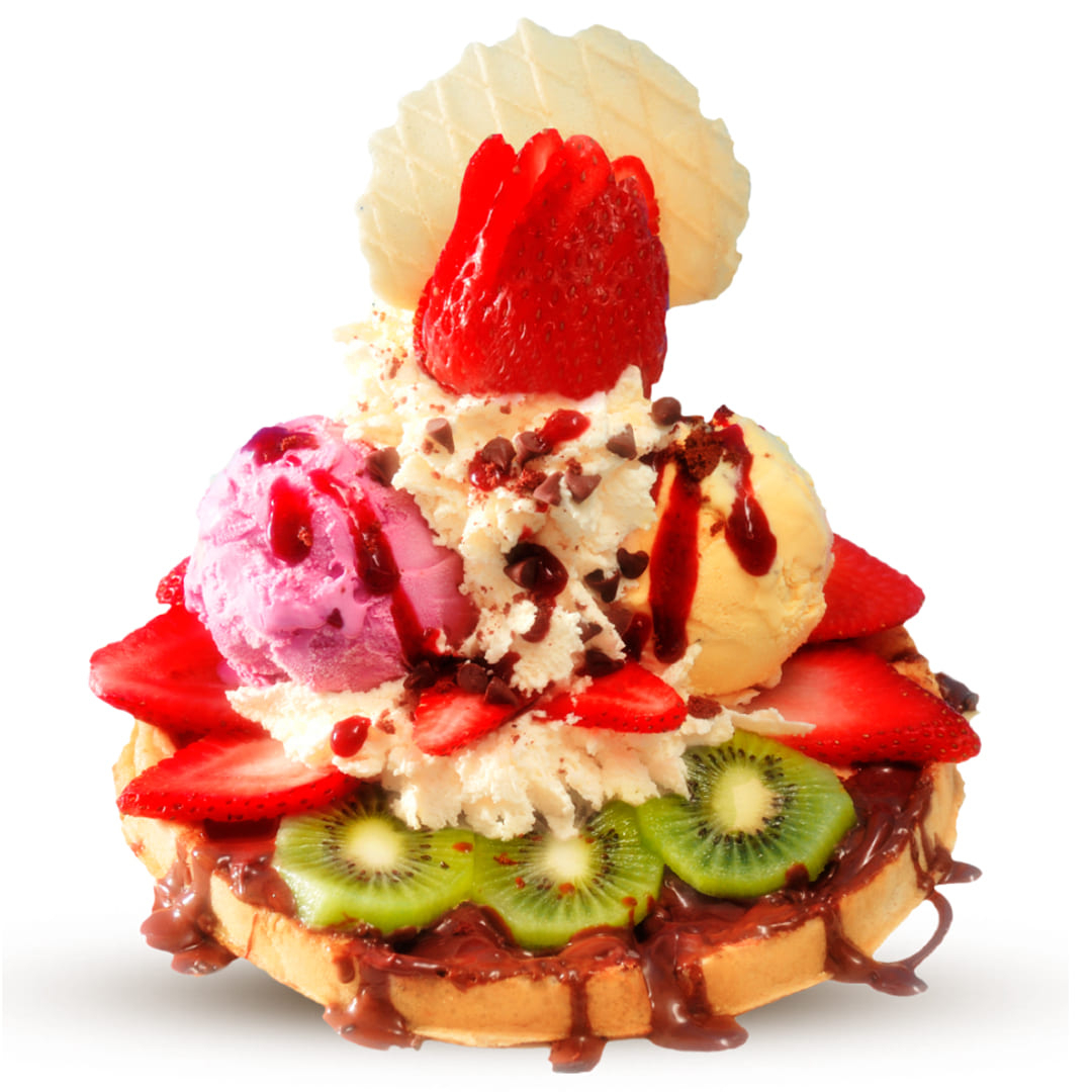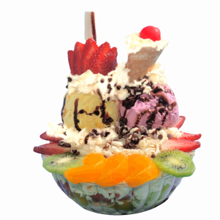 Un sabor de helado con fruta finamente picada Mango, Papaya, Fresa, Banano, Uva, Kiwi, Melocotón, Cereza, Queso, Chantilly, barquillo, Oblea, Salsa, Aderezo.