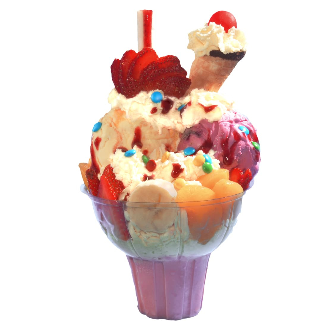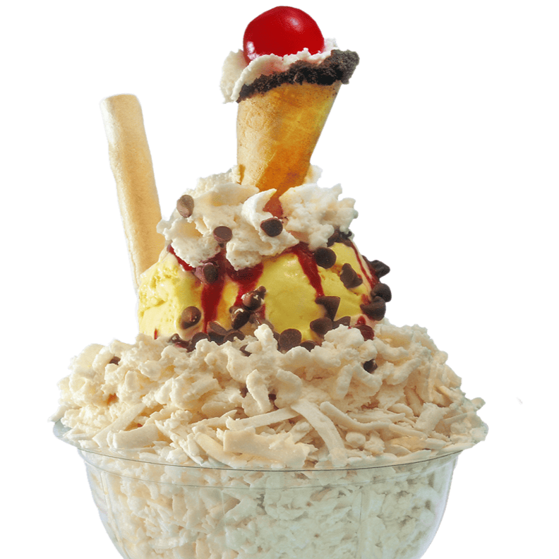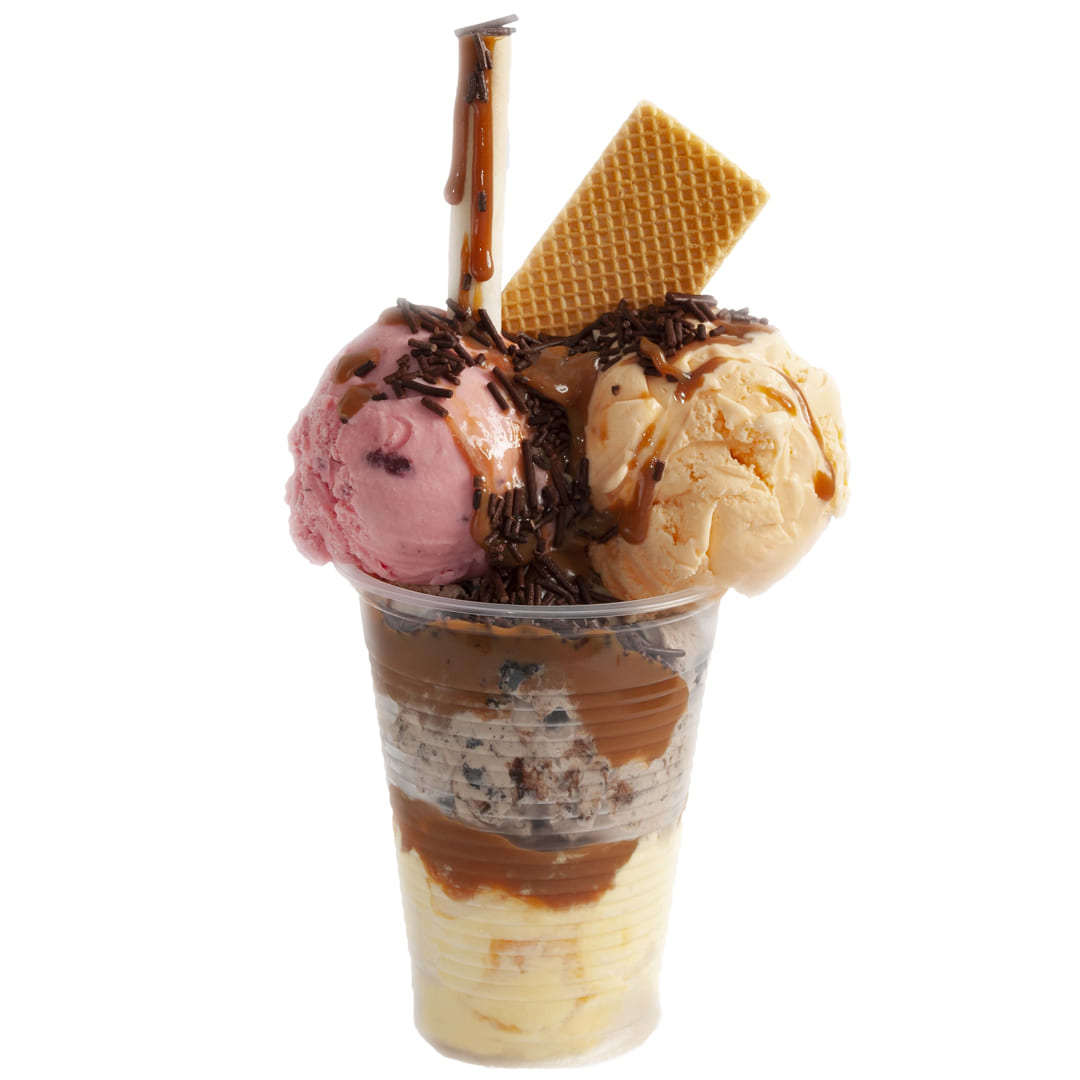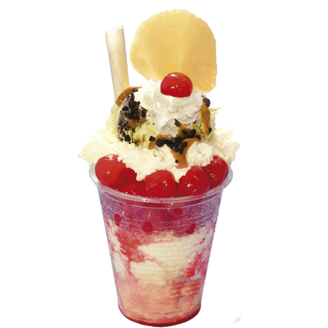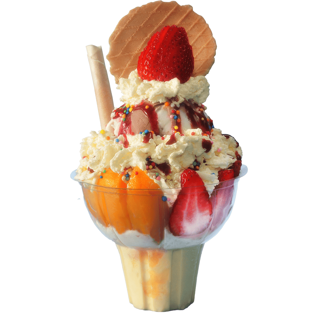 Un sabor de helado con fruta finamente picada Mango, Papaya, Fresa, Banano, Uva, Kiwi, Melocotón, Cereza, Queso, Chantilly, barquillo, Oblea, Salsa, Aderezo.