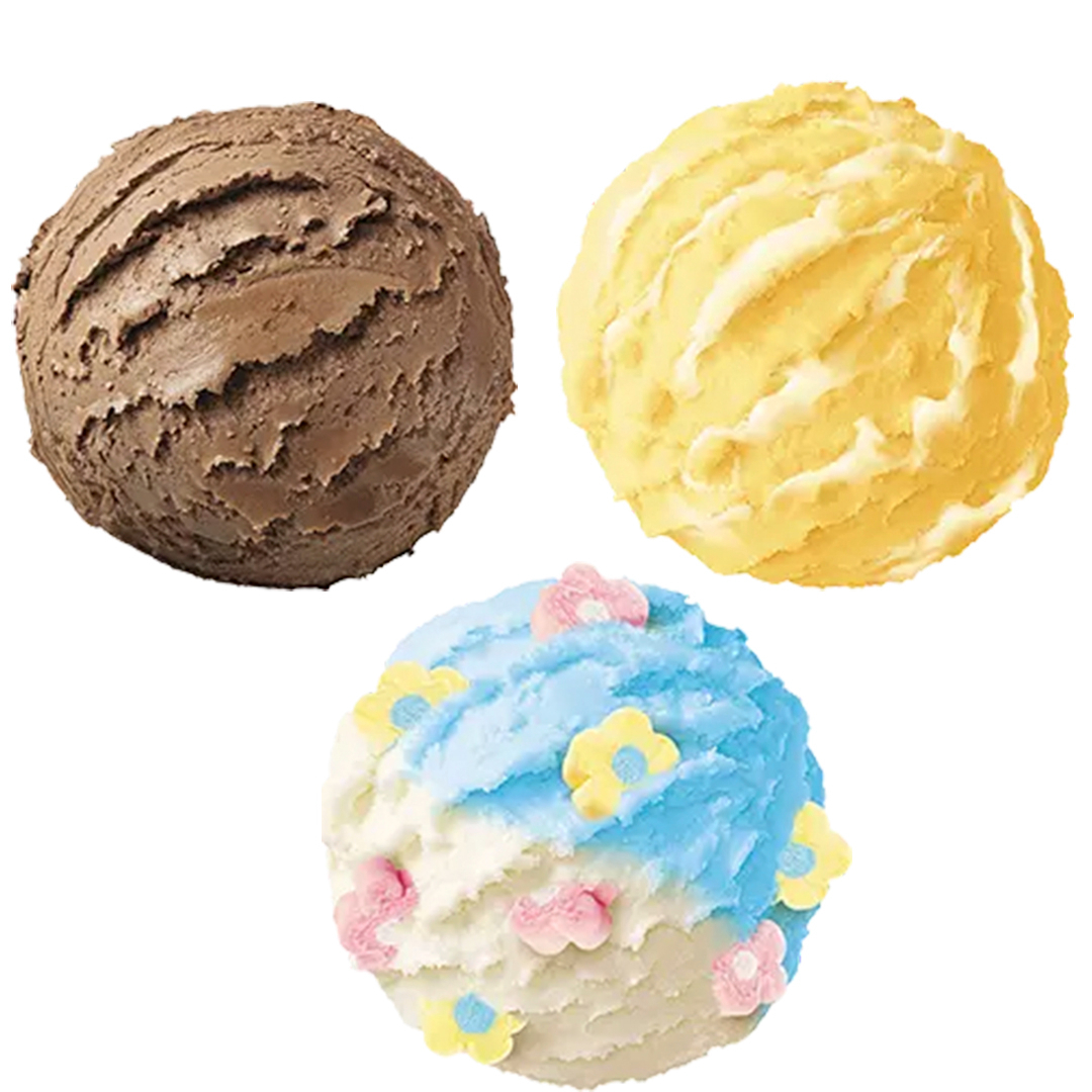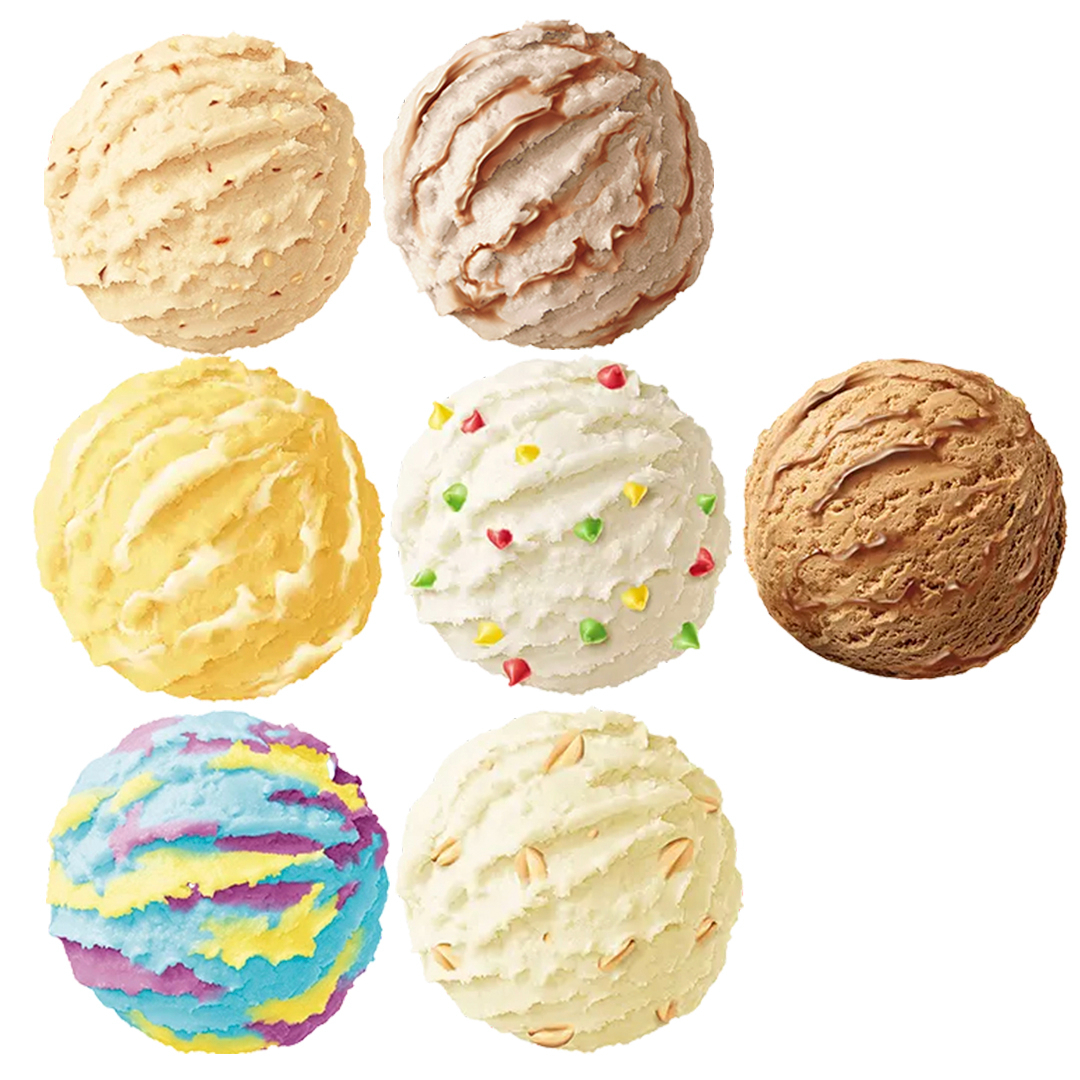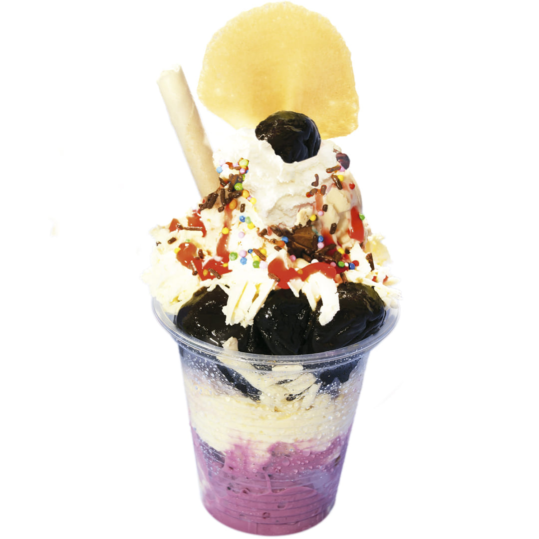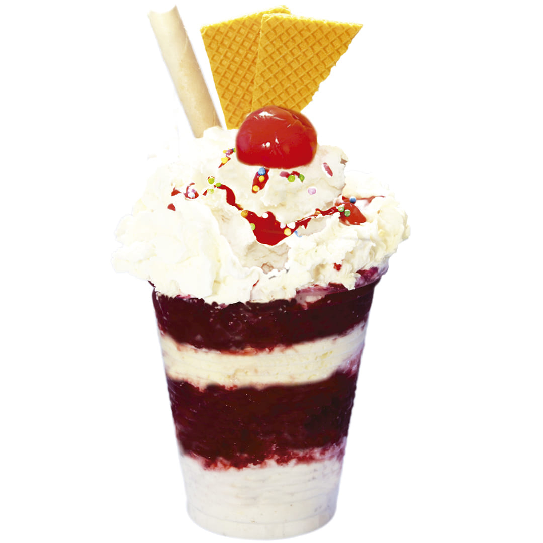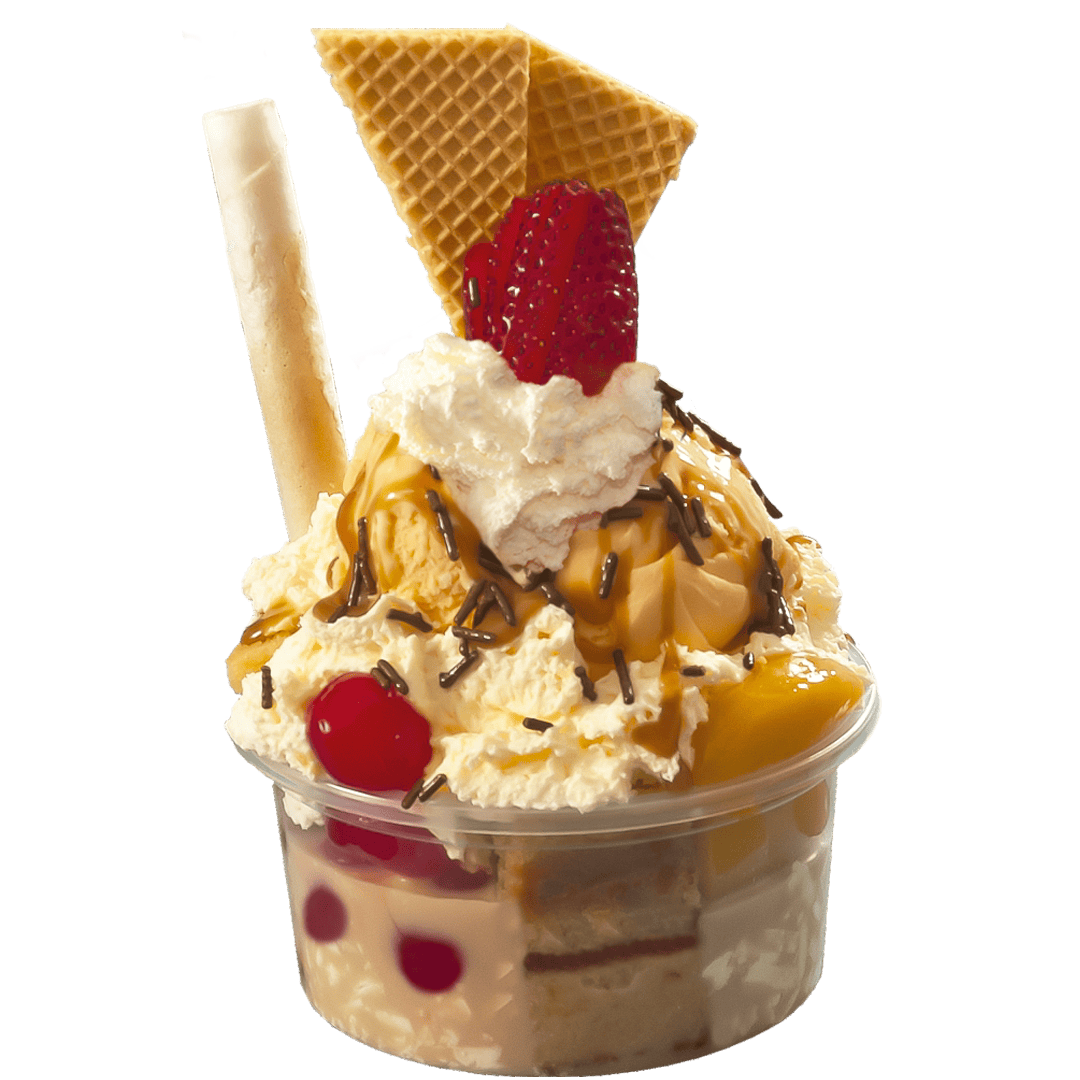 Un sabor de helado con fruta finamente picada Mango, Papaya, Fresa, Banano, Uva, Kiwi, Melocotón, Cereza, Queso, Chantilly, barquillo, Oblea, Salsa, Aderezo.