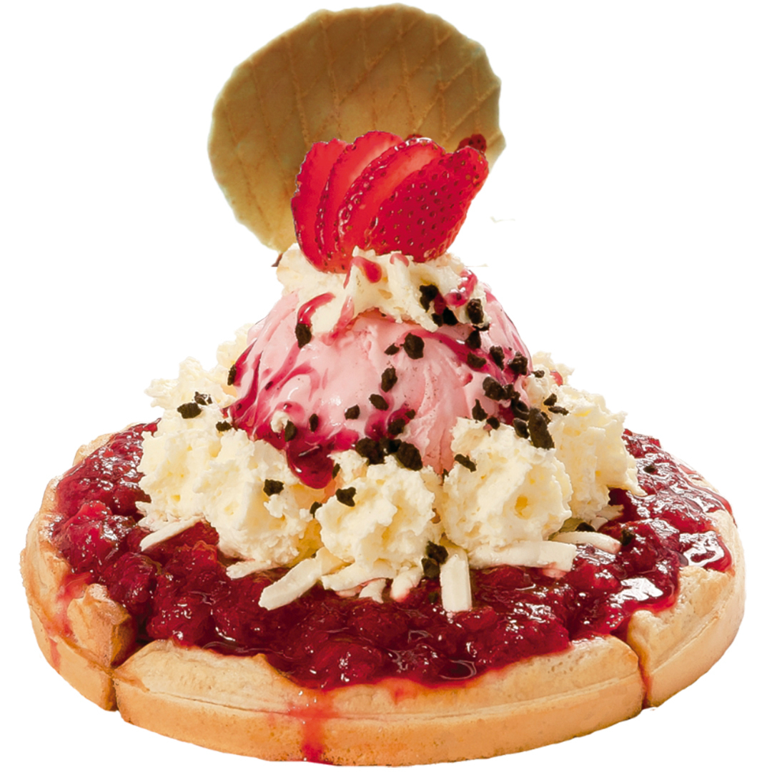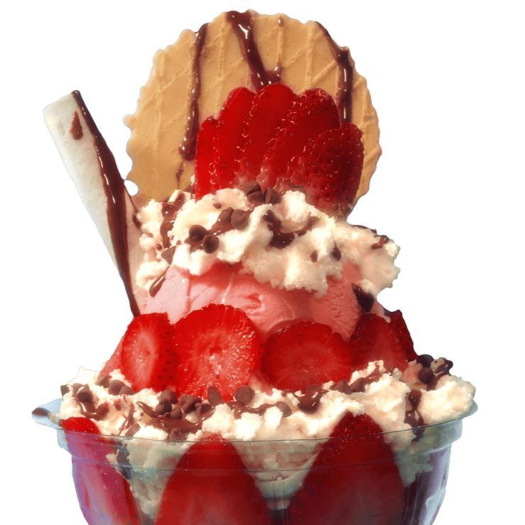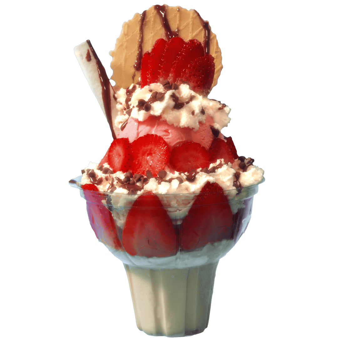Dos bolas de helado, muchas fresas, queso, chantilly, barquillo oblea salsa y aderezo