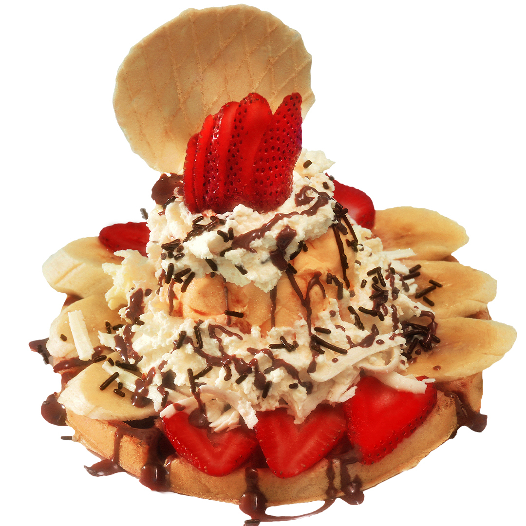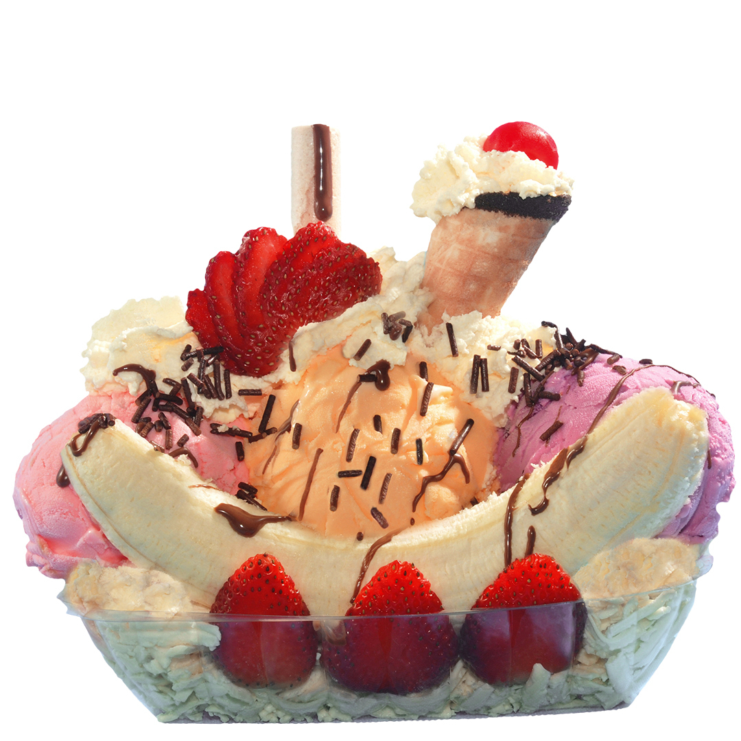 Dos bolas de helado, banano, fresa, cereza, queso, chantilly, barquillo, oblea, salsa y aderezo