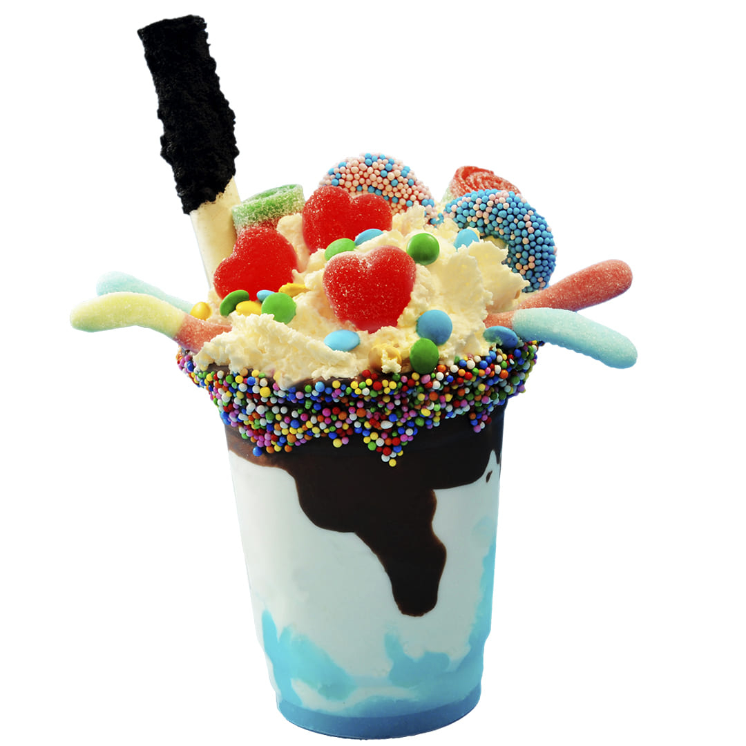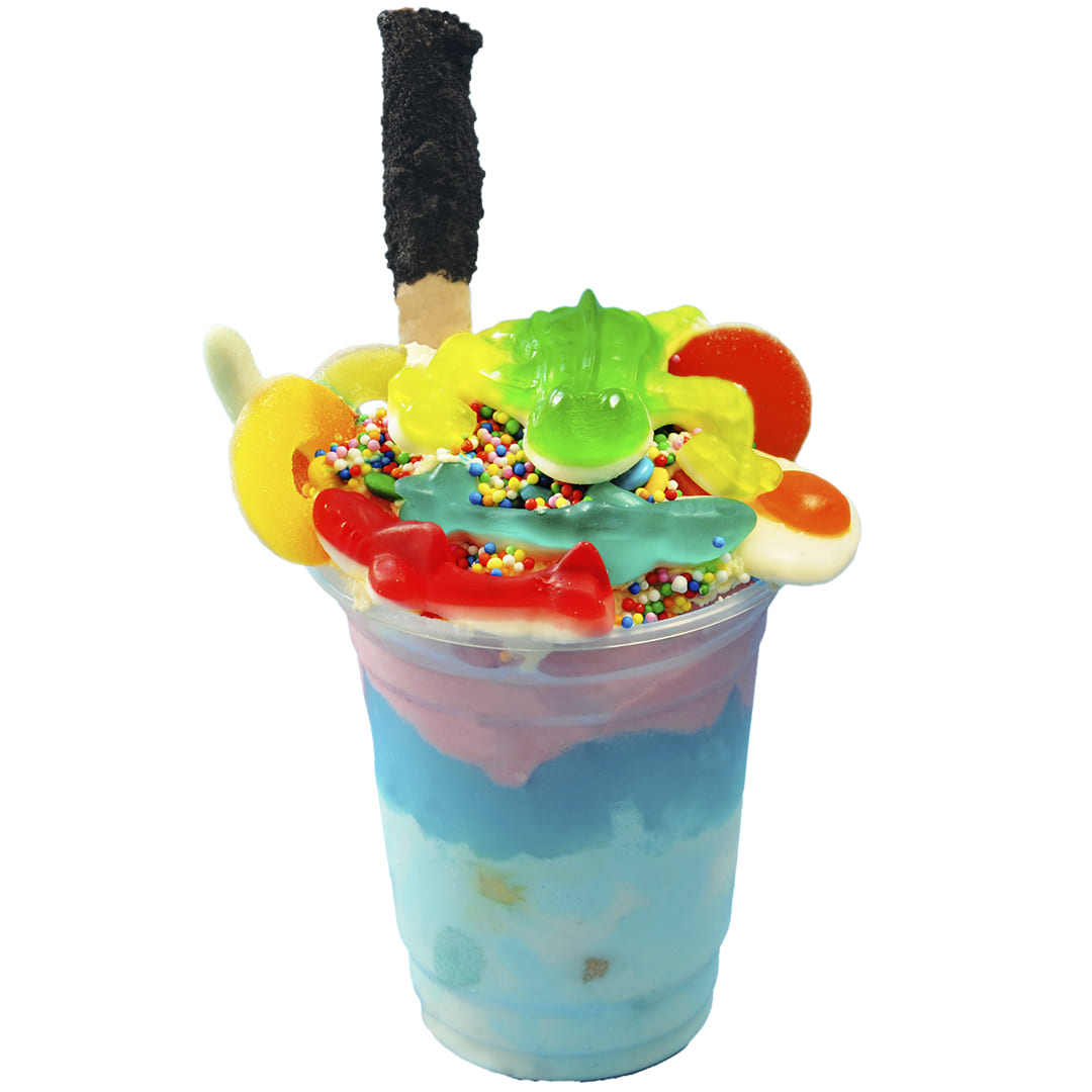 Dos bolas de helado, variedad de gomitas, barquillo michelado, lluvia de colores, salsa y aderezo