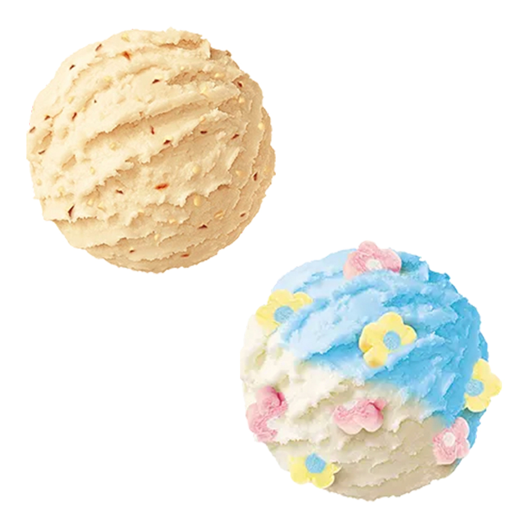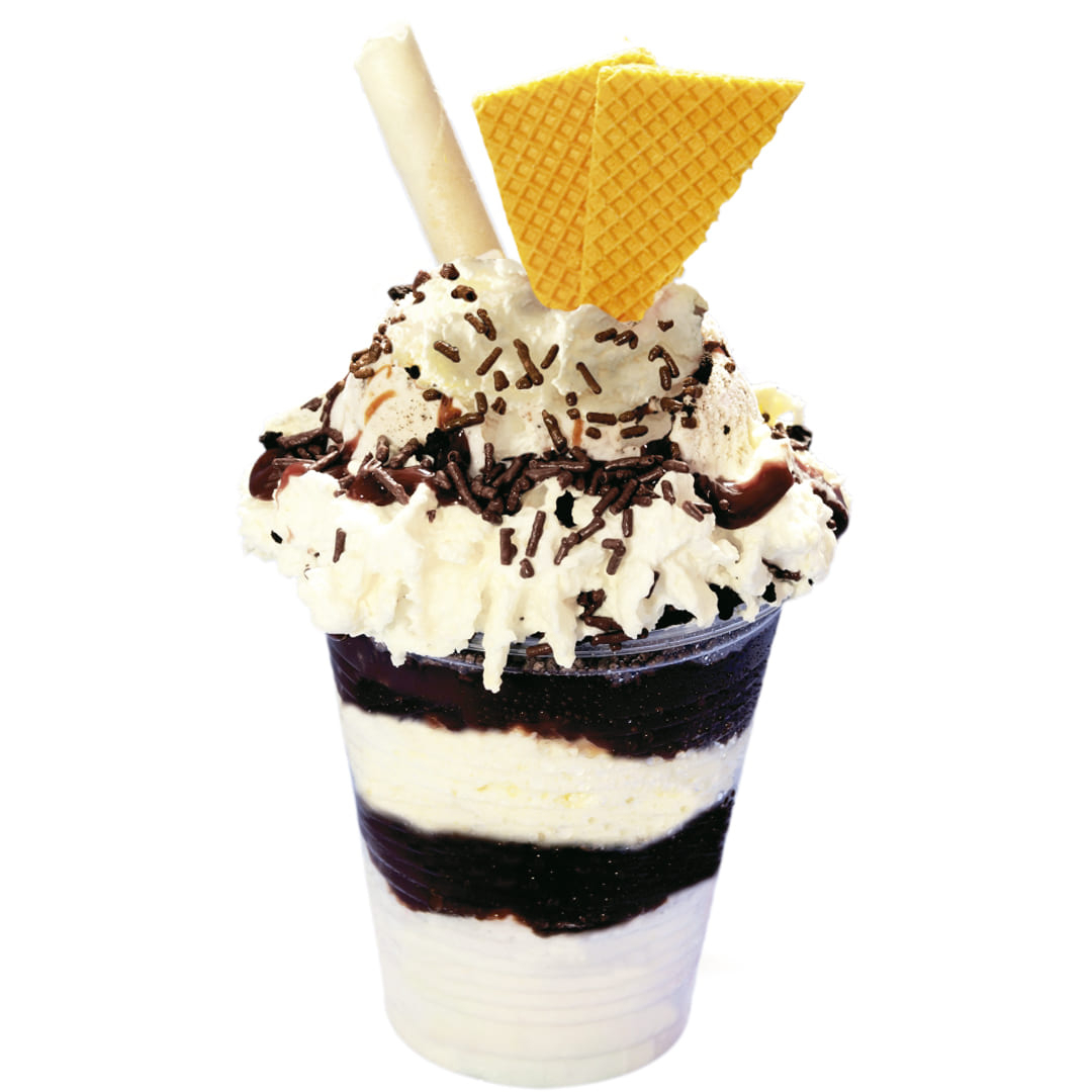 Dos bolas de helado, exquisita salsa de la casa, queso, chantilly, barquillo, galletas, salsa y aderezo