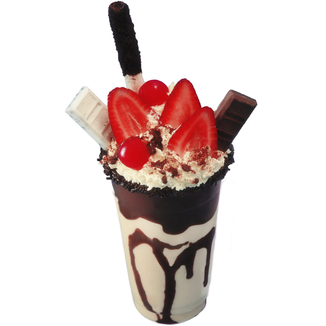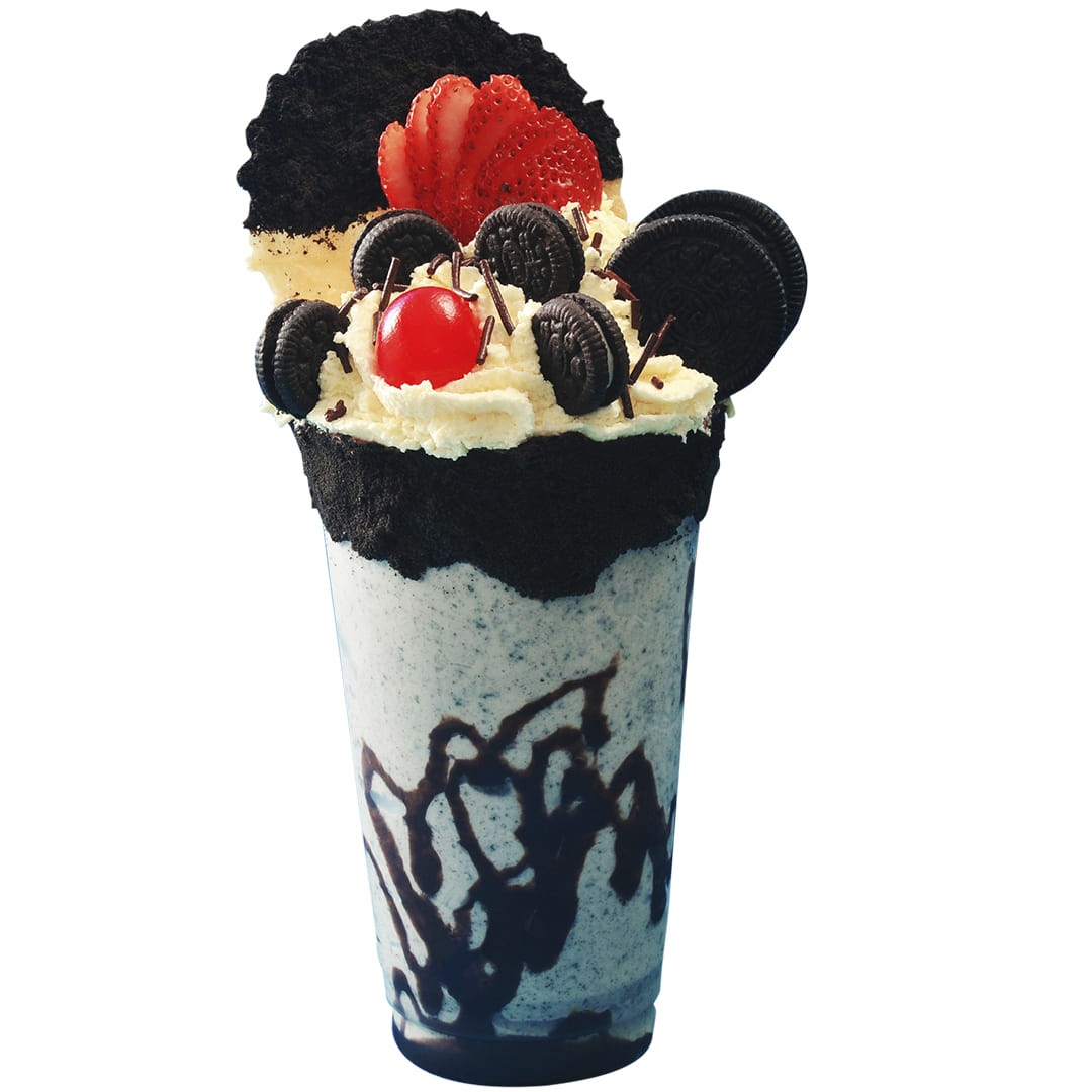 Malteada de oreo, salsa hersheys, galleta oreo, nutella, fresa, cereza, michelado de oreo, chantilly, oblea, salsa y aderezo