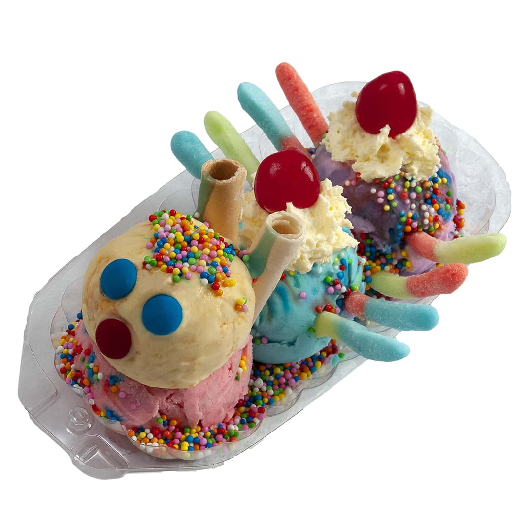 Cuatro bolas pequeñas de helado, chantilly, cerezas, gomitas, mym, barquillos, lluvia de colores, salsa y aderezo