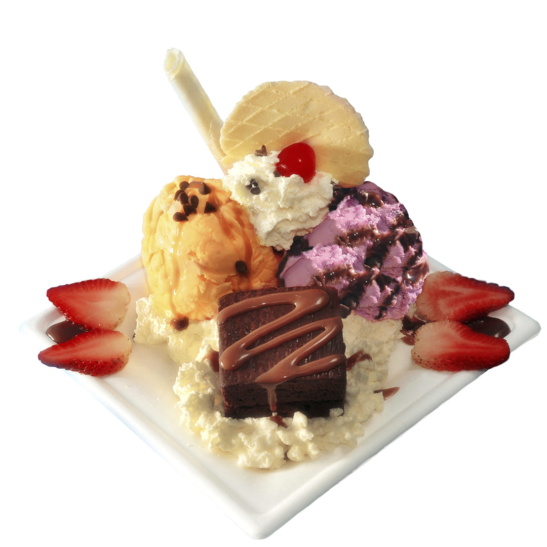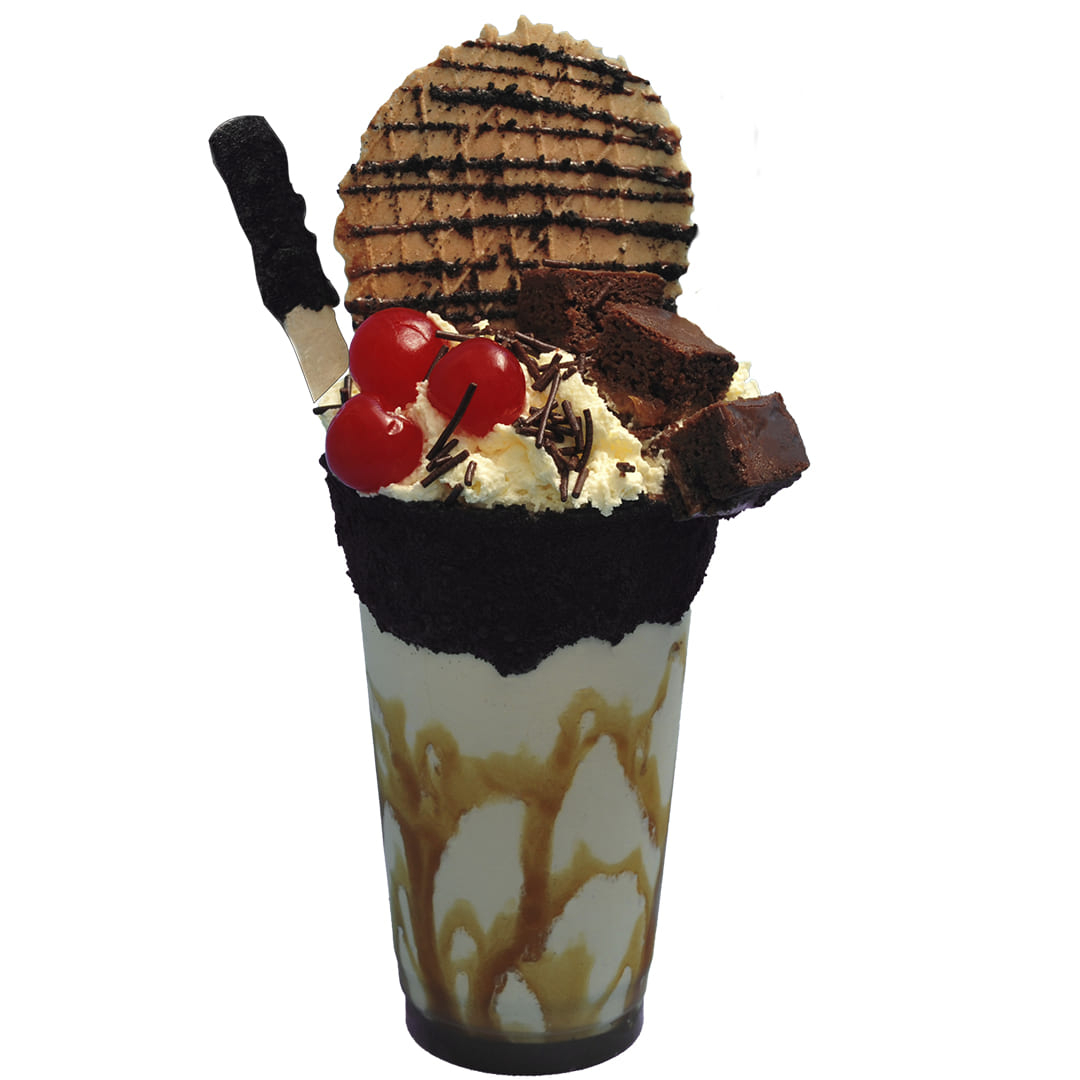 Dos bolas de helado, brownie relleno de arequipe, fresa, cereza, chantilly, barquillo, oblea, salsa y aderezo