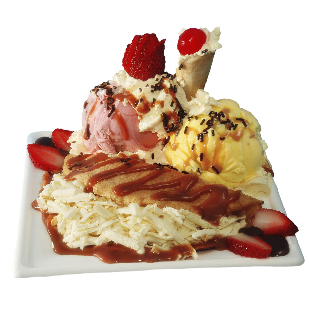 Tres bolas de helado, banano, fresa, cereza, queso, chantilly, barquillo, oblea, salsa y aderezo