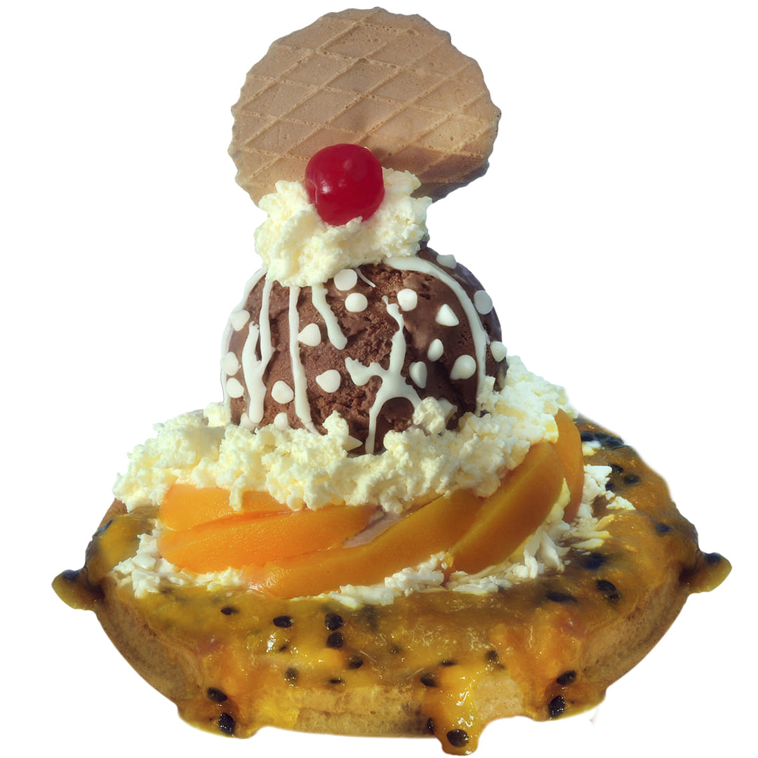 Dos bolas de helado, suave creppe, mucho queso, mucho arequipe, fresa, cereza, chantilly, barquillo, salsa y aderezo.