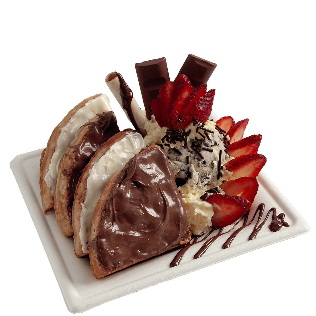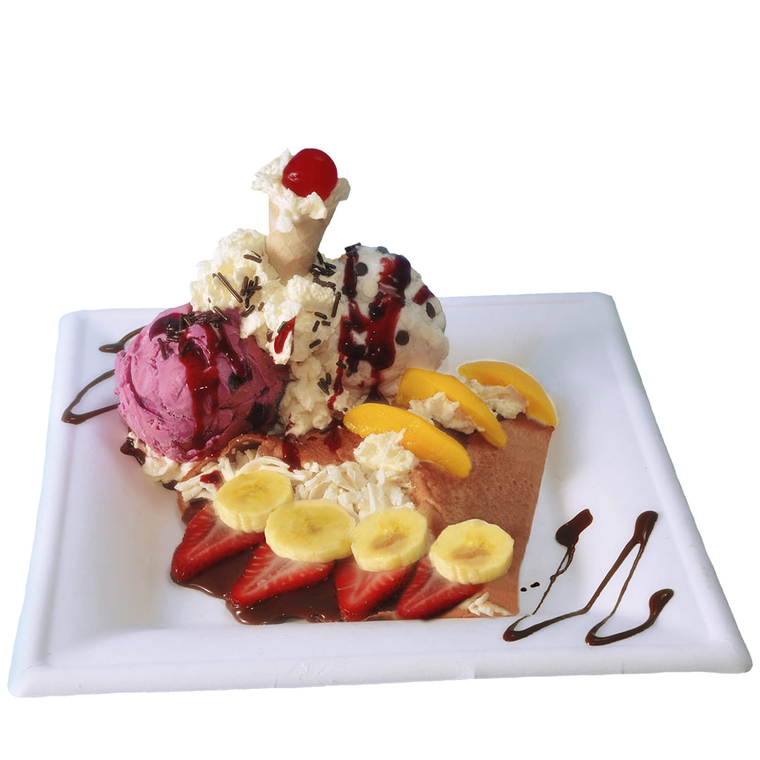 Dos bolas de helado, suave creppes, nutella, fresa, melocoton, banano, cereza, queso, chantilly, barquillo, salsa y aderezo