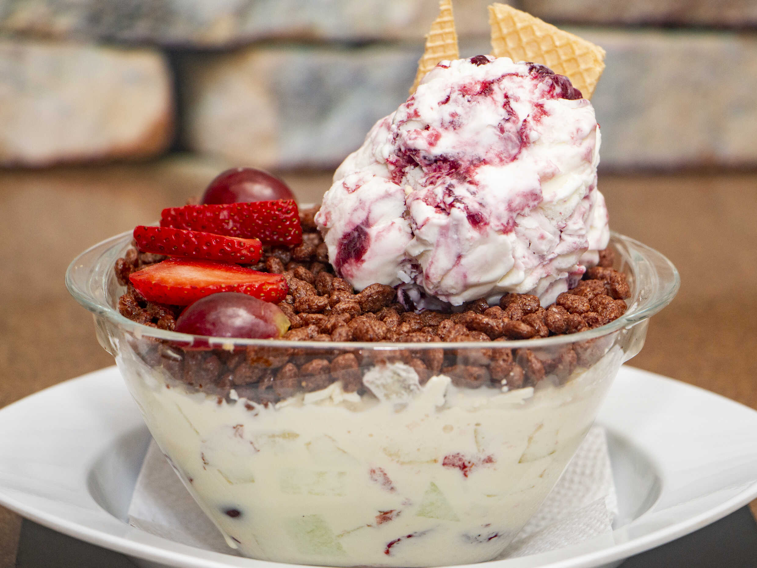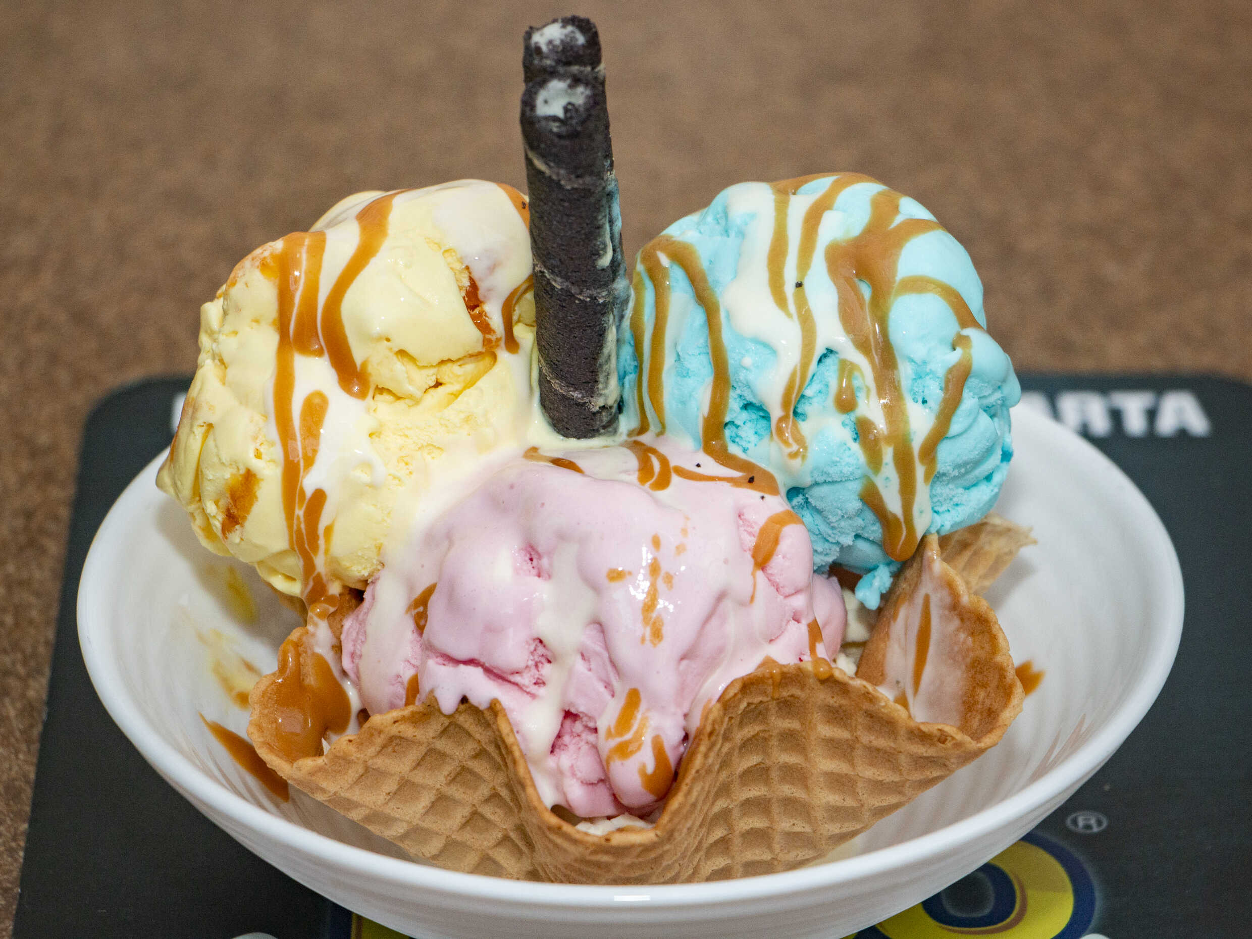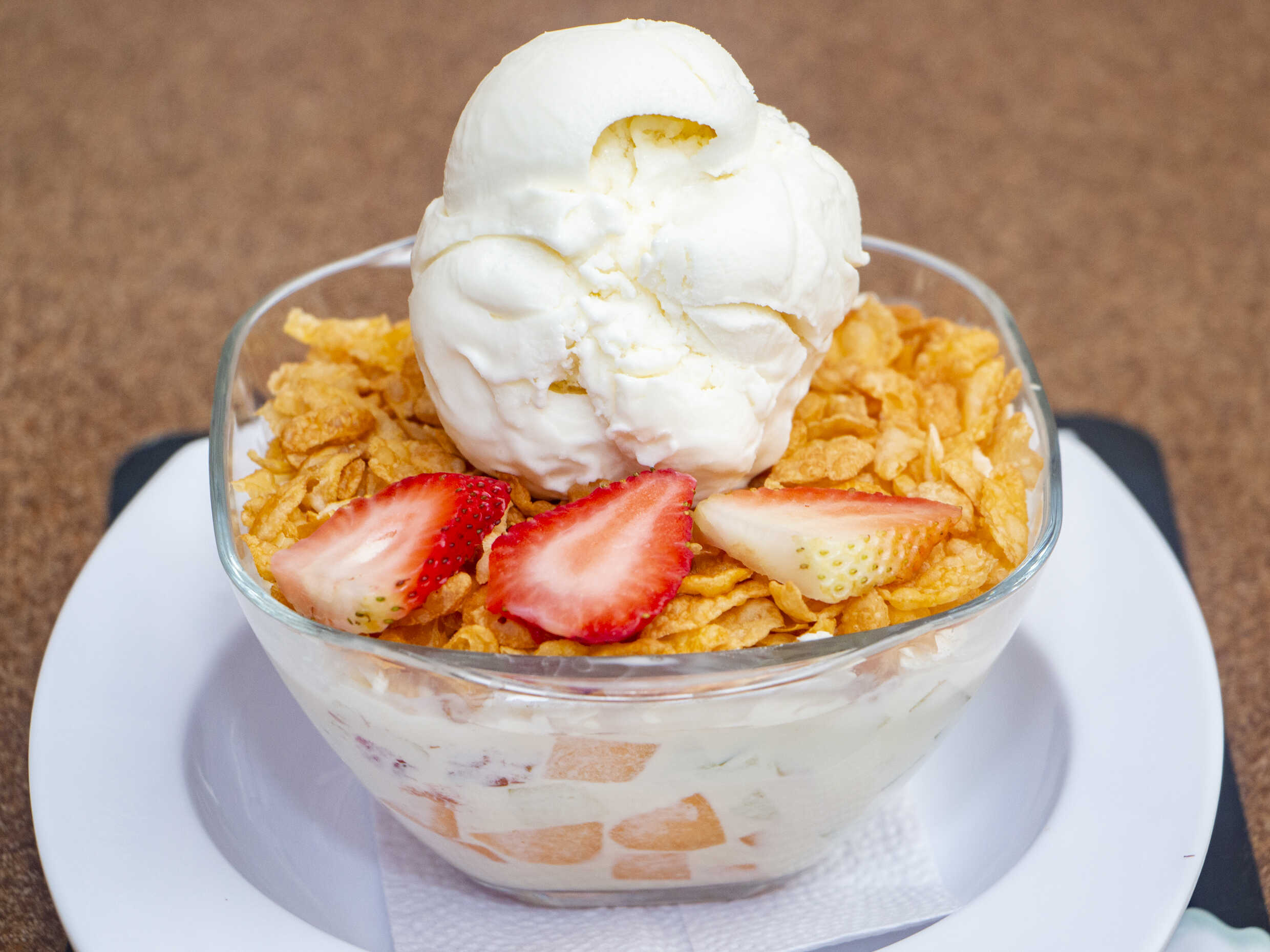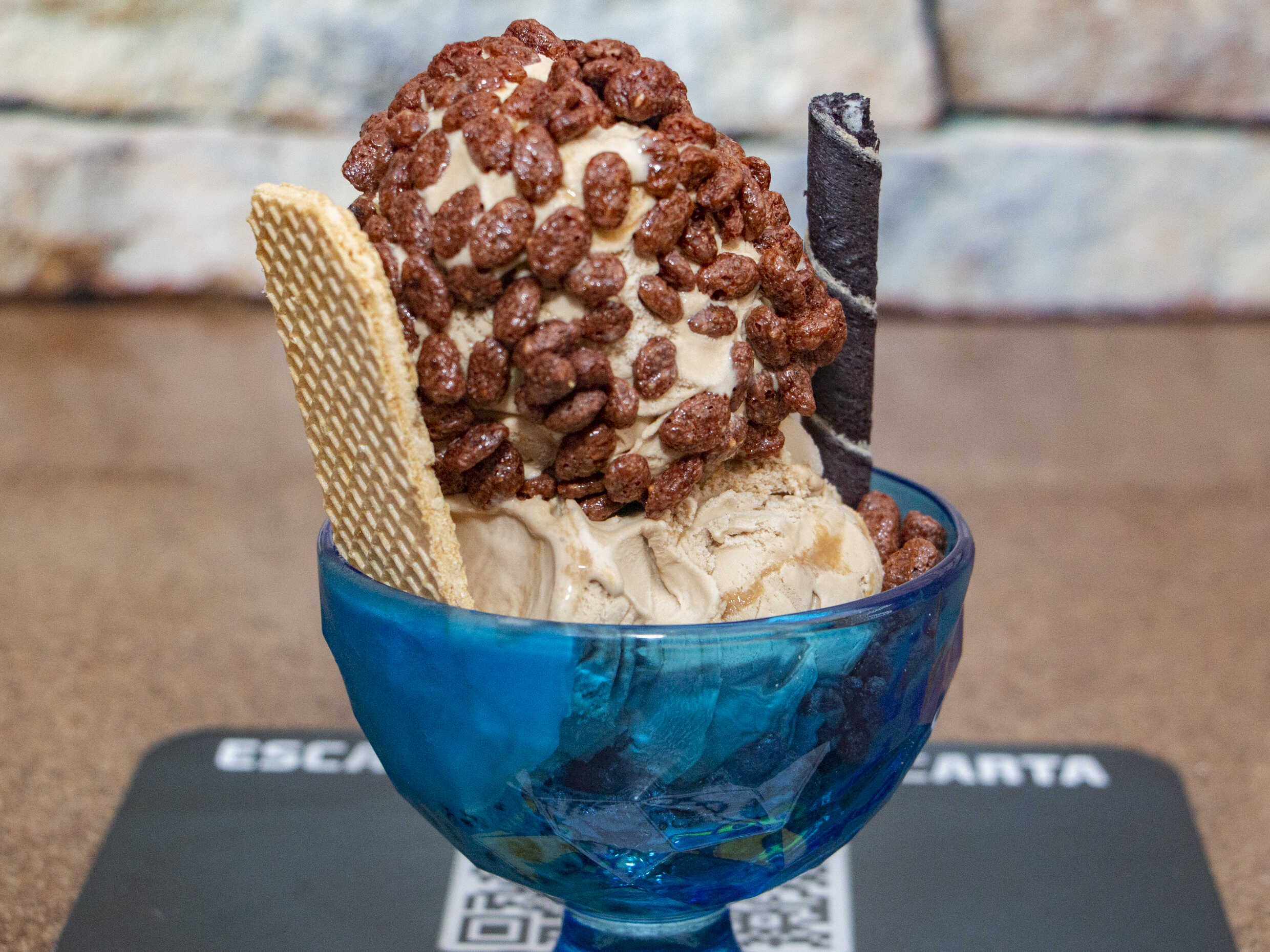 Tres sabores de helado, acompañados de piña en almíbar, arroz achocolatado, crema de leche endulzada, barquillo, chantilly, maní y cereza.