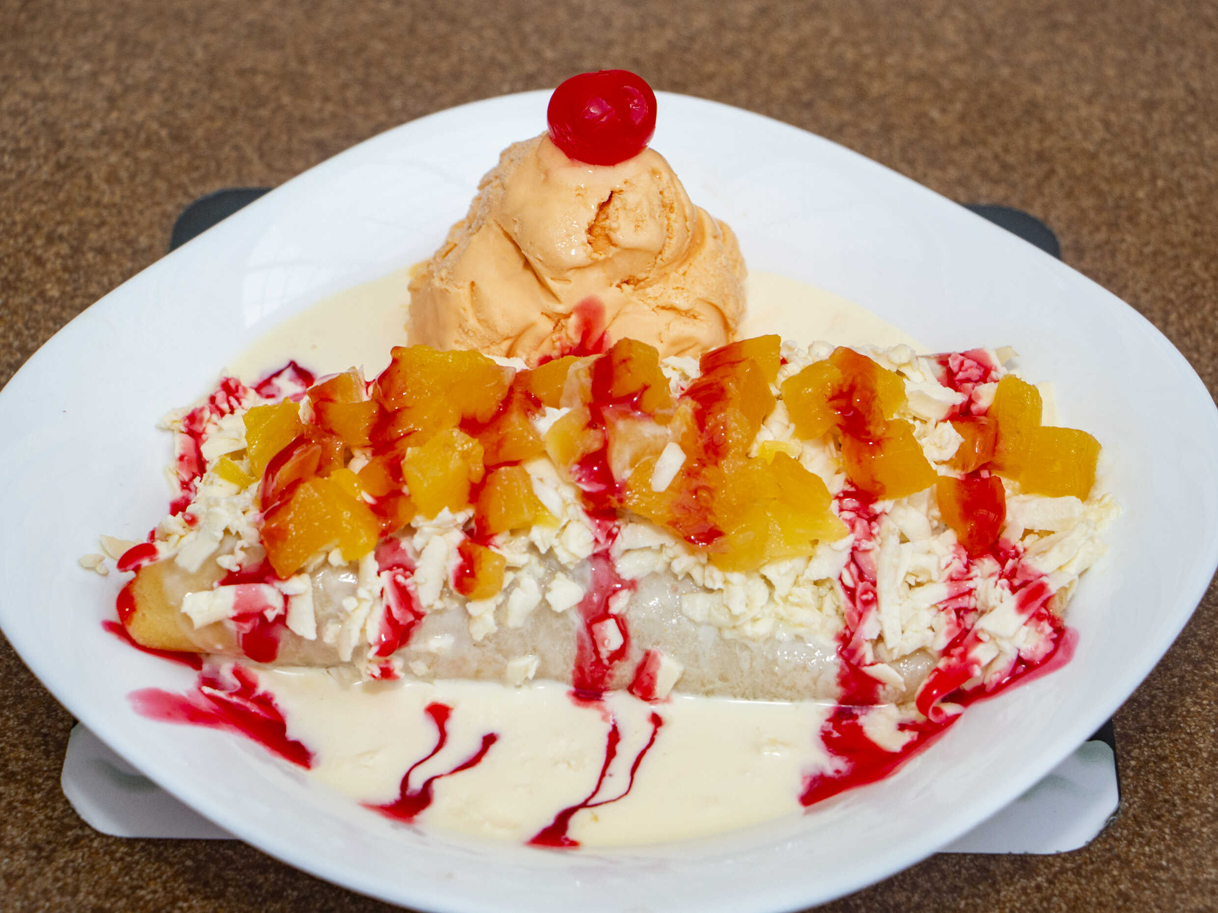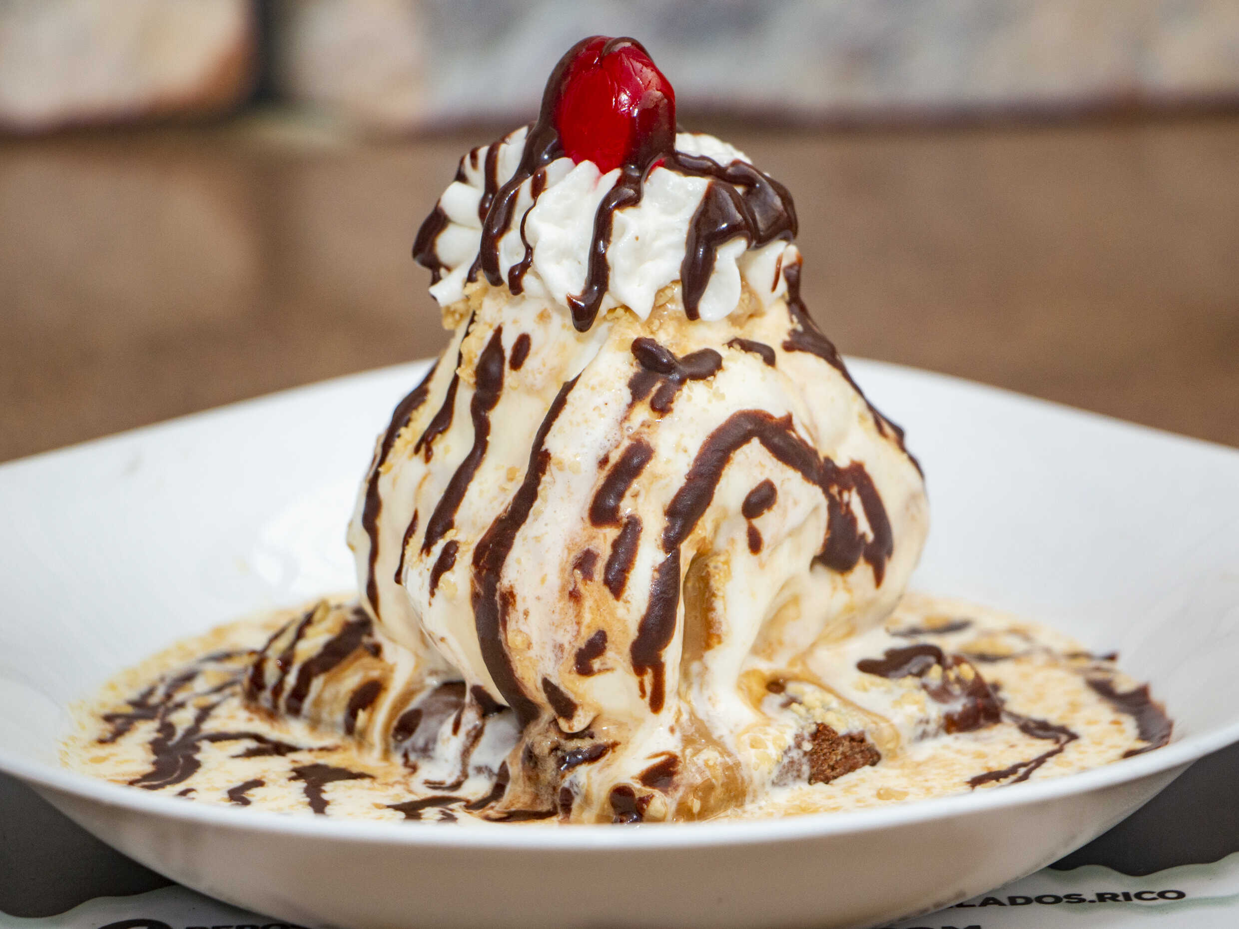 Tres sabores de helado, acompañados de banano, cerezas, piña en almíbar, maní, barquillo, galleta, chantilly, lluvia de chocolate y salsa.