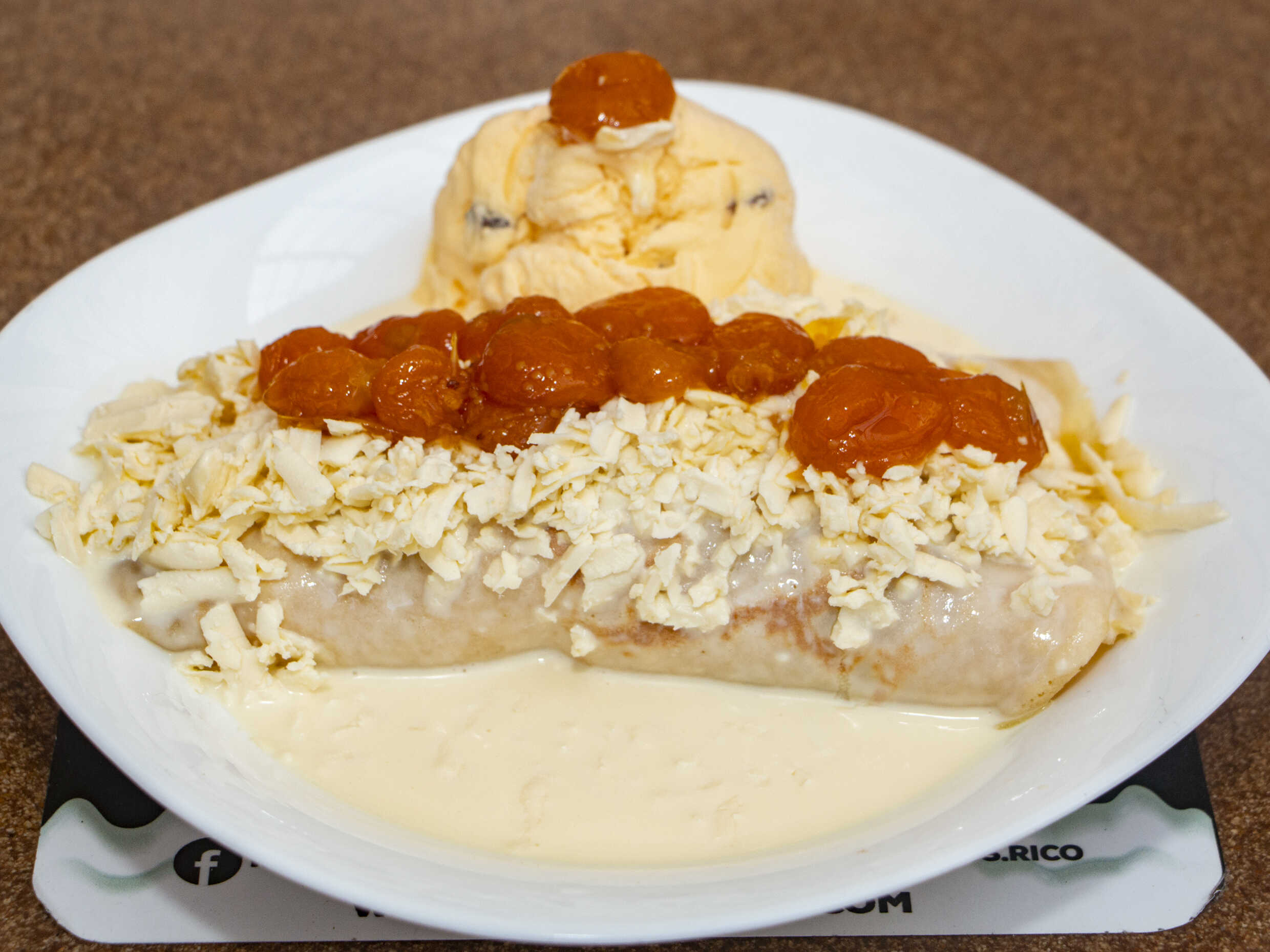 Crepe acompañado de un sabor de helado, salsa de uchuva, crema de leche endulzada, queso y cereza.
