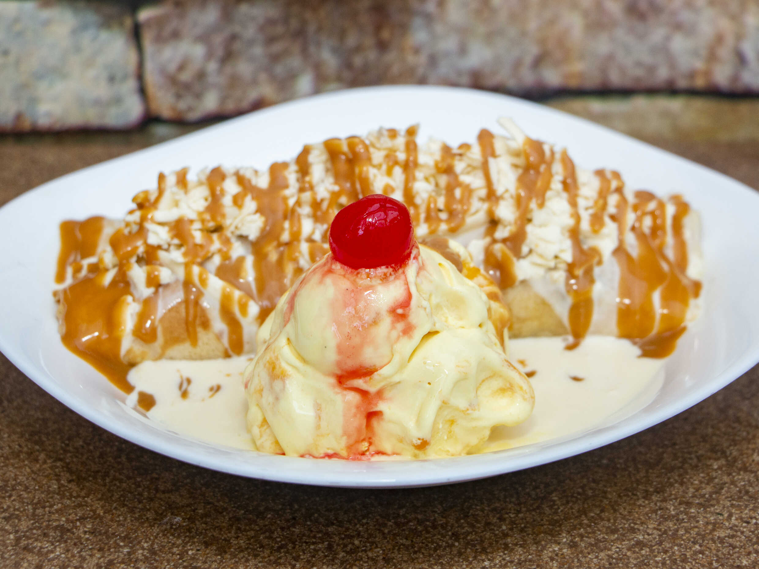 Tres sabores de helado, salsa de arequipe, barquillo, elegir: maní, queso o arroz achocolatado (crispy).