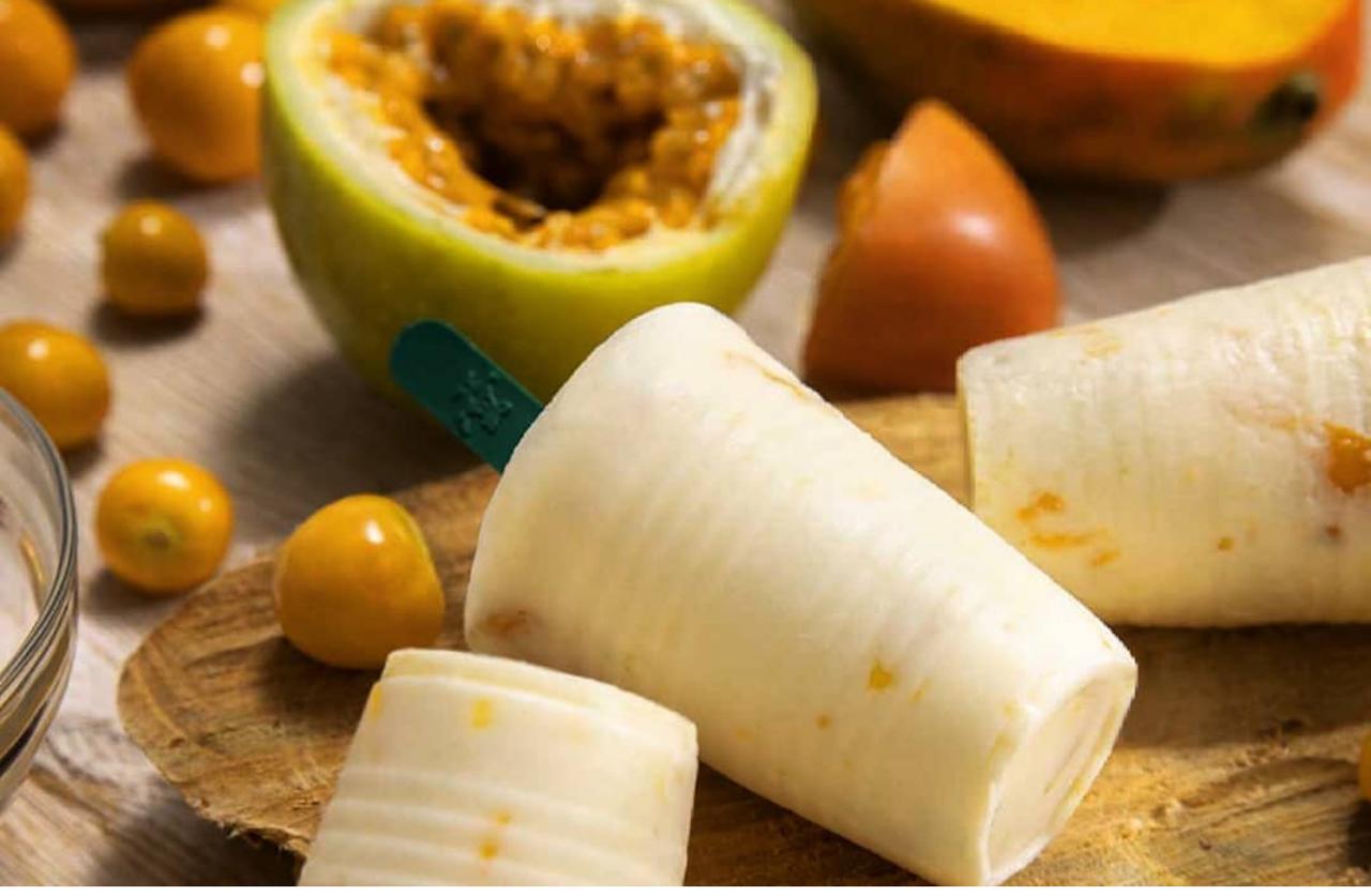 Dos sabores de helado, acompañados de maracuyá, mango, salsa de uchuva, chantilly, barquillo y salsa.