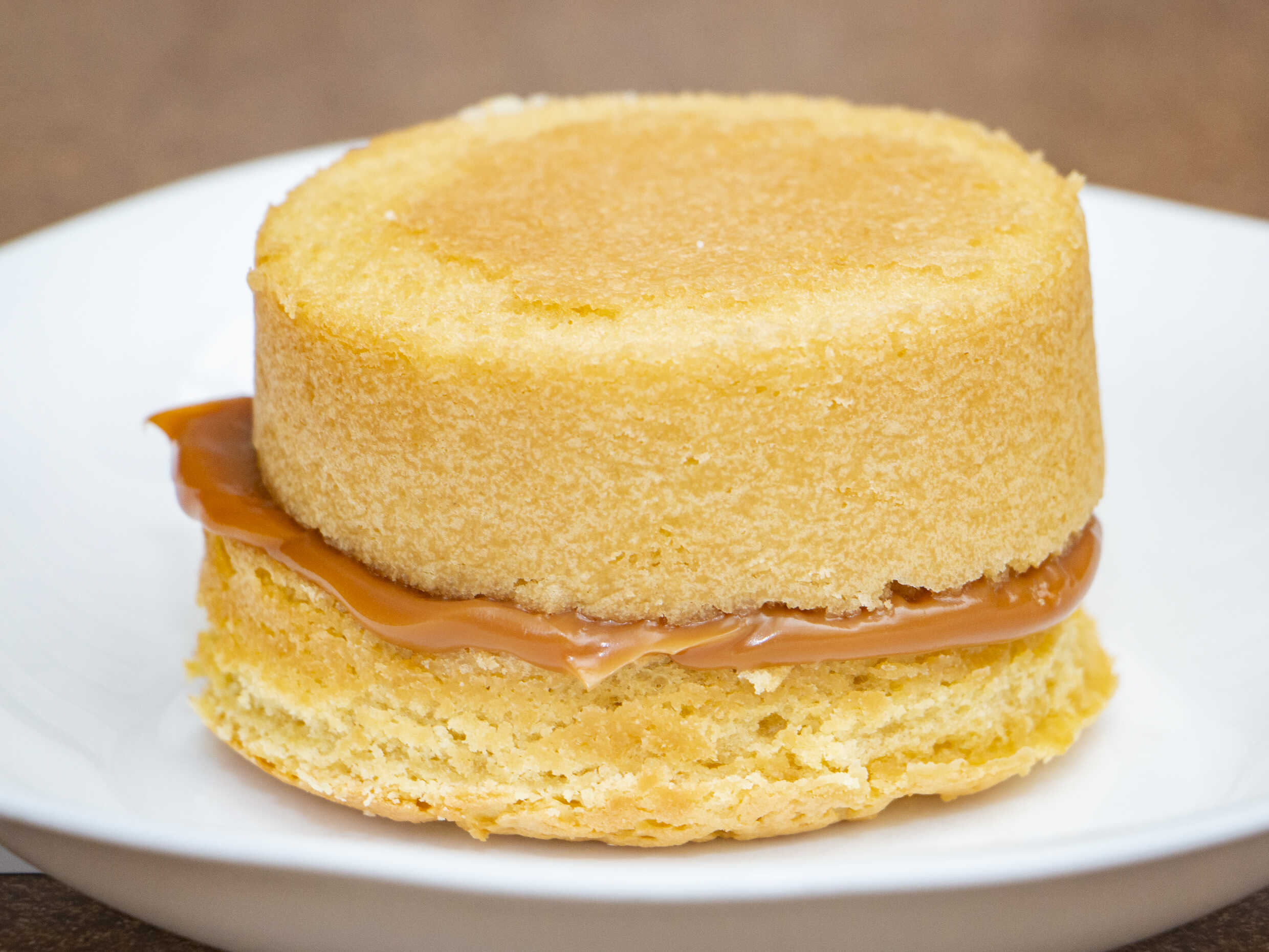 Helado de vainilla, veteado de caramelo y veteado de mora, acompañados de queso, barquillo, chantilly, cereza y crema de leche endulzada.