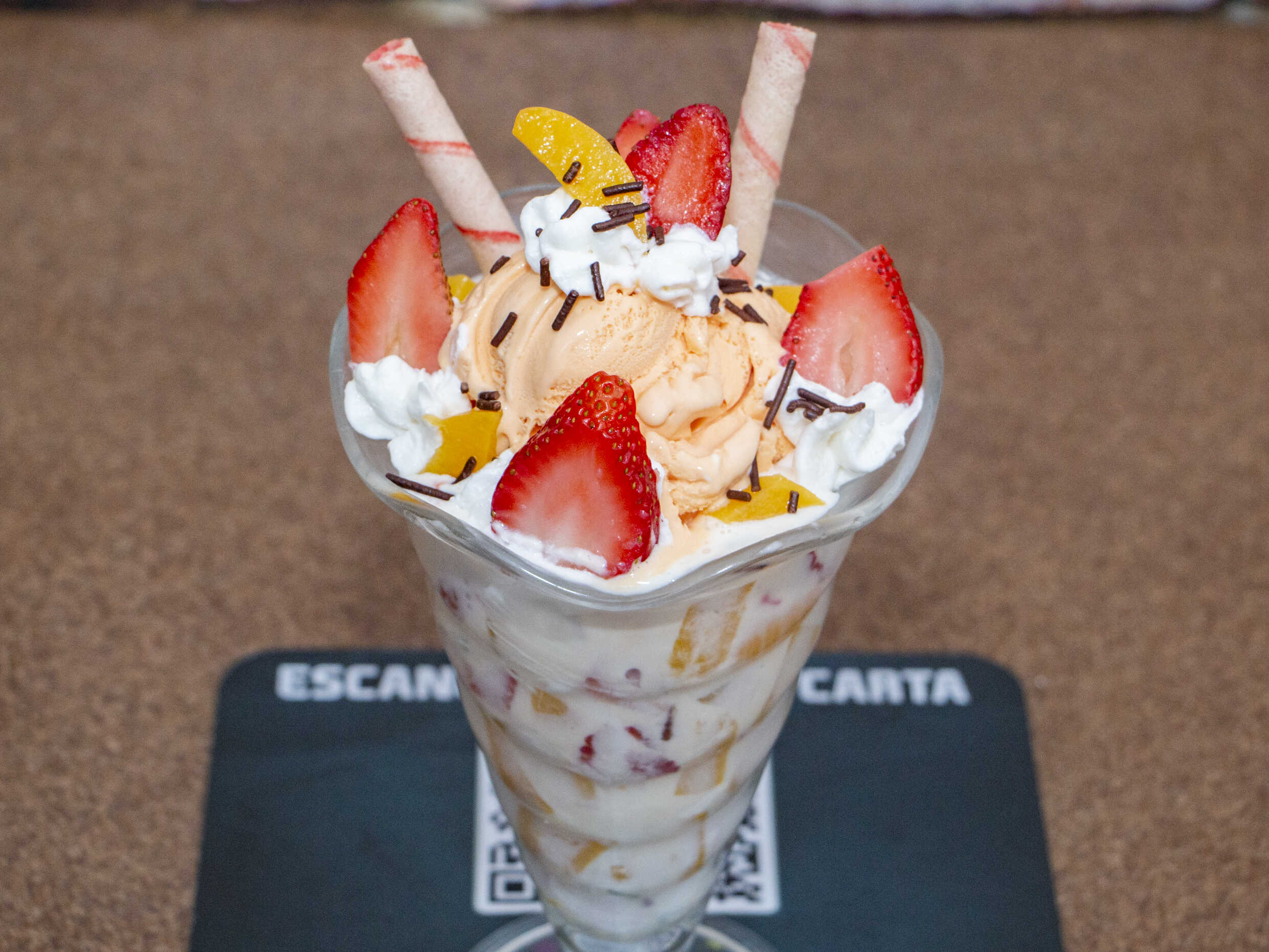 Combinación de frutas, acompañado de un sabor de helado, chantilly, barquillo, galleta wafer, cereza y leche condensada.