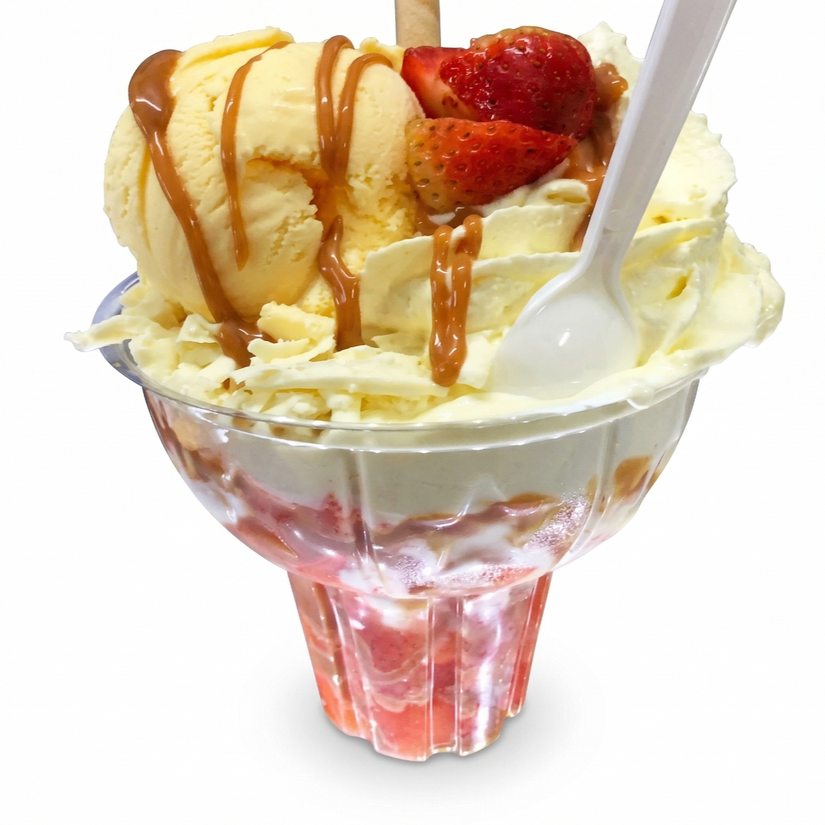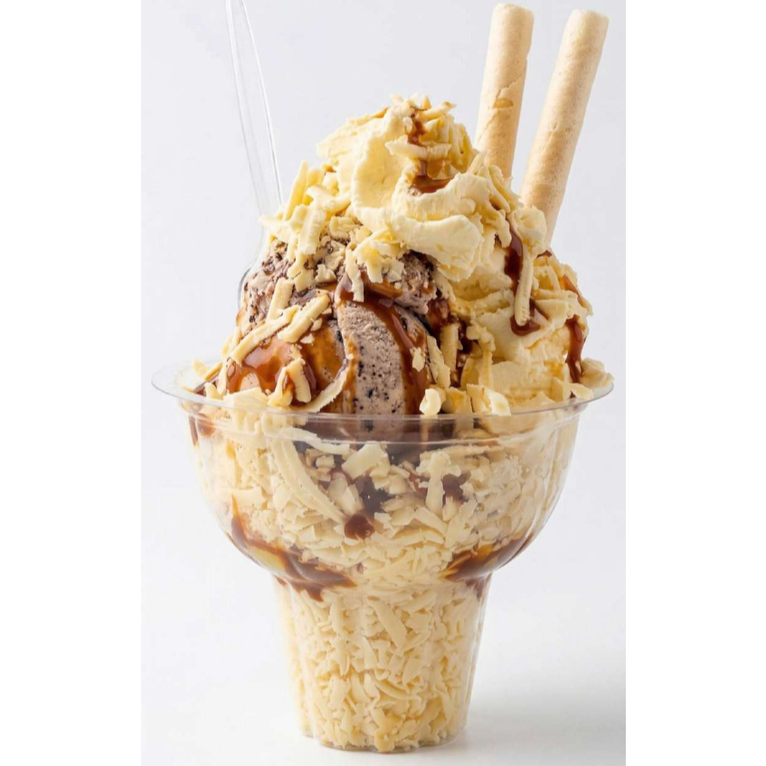 La experiencia completa en copa: 2 porciones de helado a elección, crema chantilly, 1 salsa y 2 barquillos grandes.