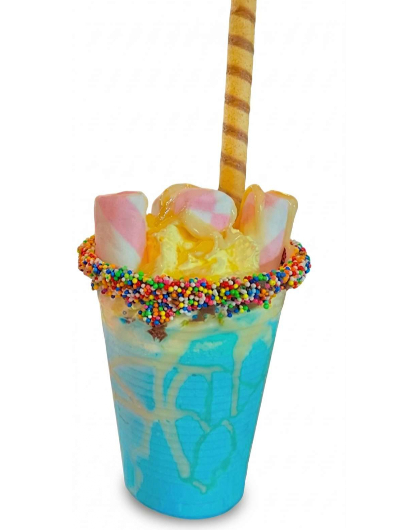 Divertido sabor con borde en Nutella y chispas de colores, salsa de lechera, barquillo de chocolate, crema chantilly y masmelos.