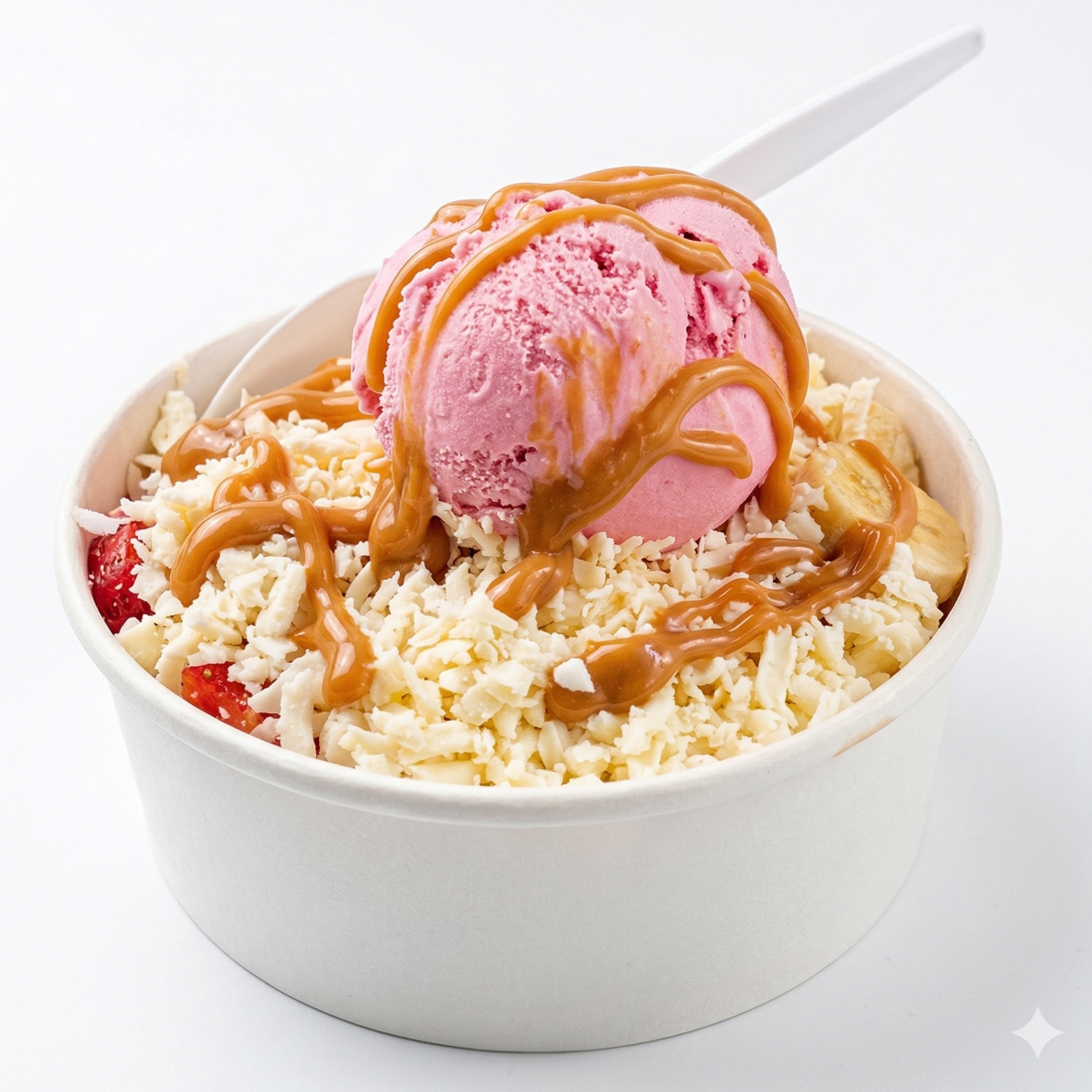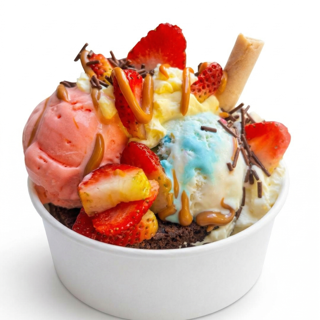 Combinación dulce y ensalada con 2 porciones de helado a elección, queso rallado, 1 salsa de tu preferencia, chantilly y 2 barquillos grandes.