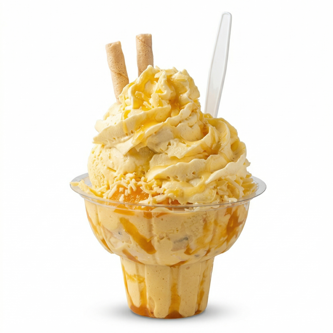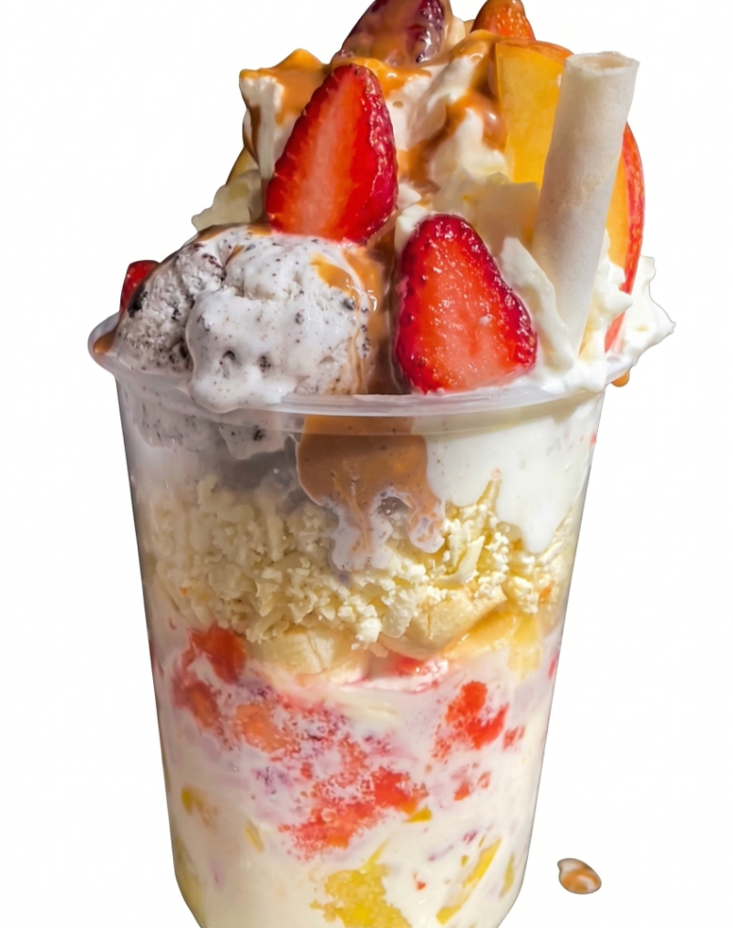 Sabor tropical con 2 porciones de helado a tu elección, duraznos, mangos, chantilly y 2 barquillos grandes.