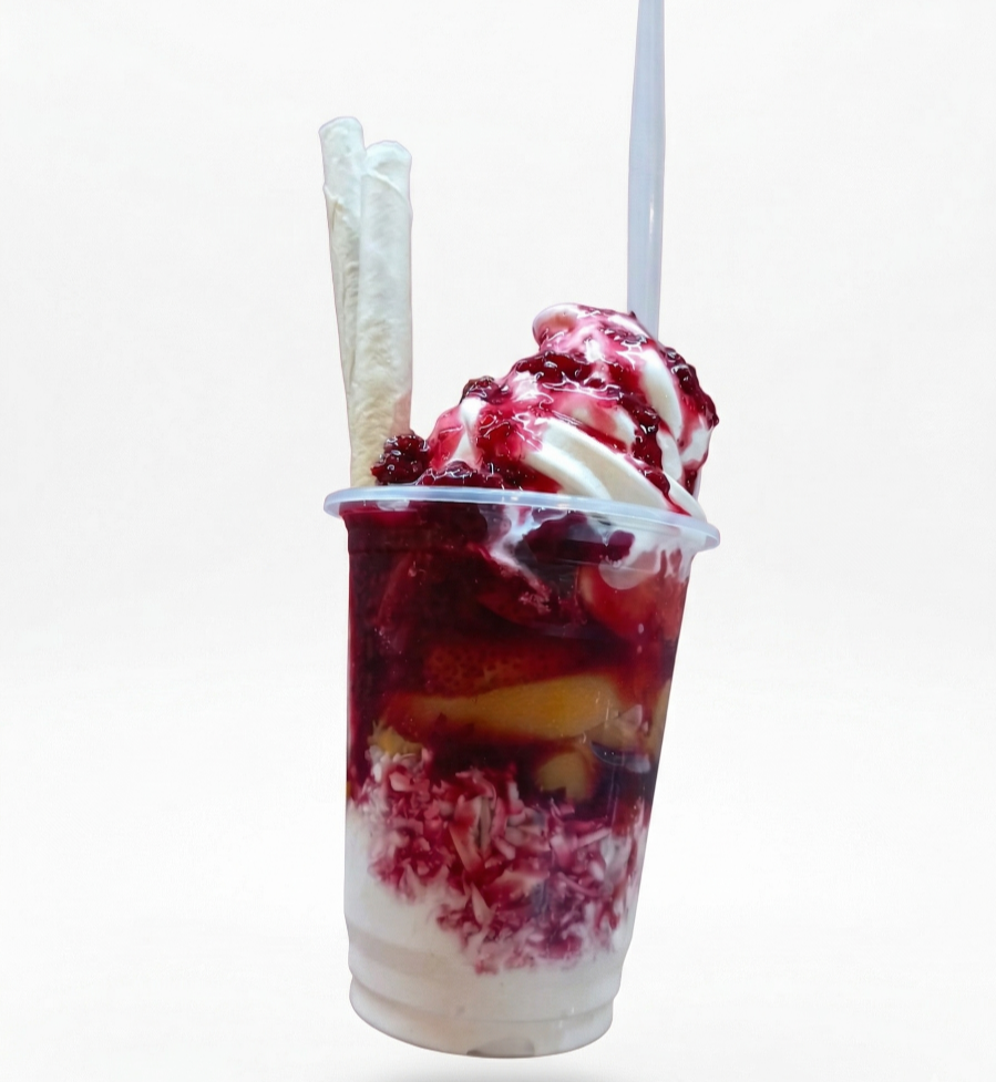 2 Porciones de helado suave (vainilla) más 1 topping a elección, queso o fruta: (cereza, durazno, brevas, mango, fresas).