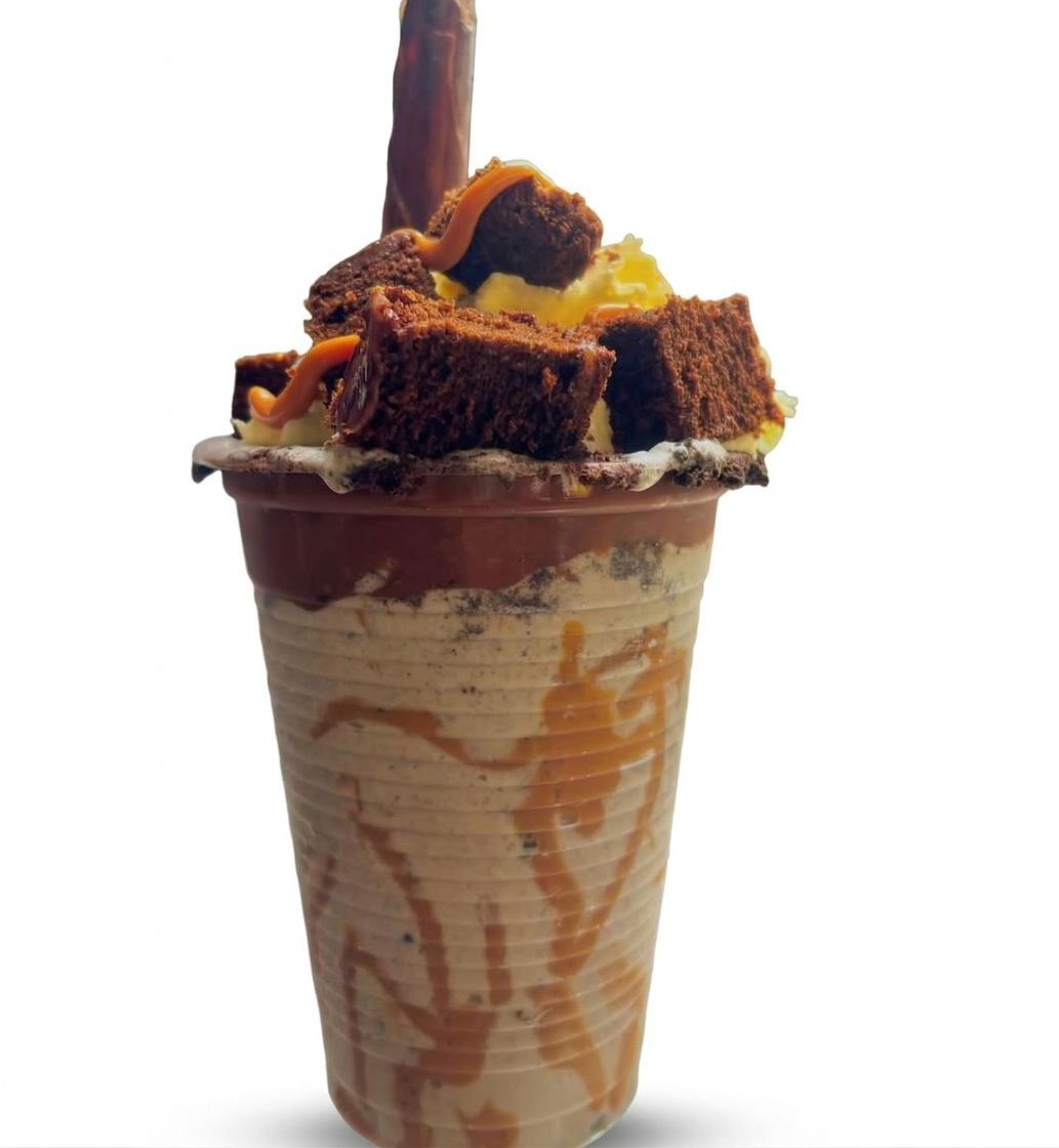 Irresistible malteada con borde en Nutella y Oreo, salsa de arequipe, crema chantilly, barquillo de chocolate y trozos de brownie artesanal.