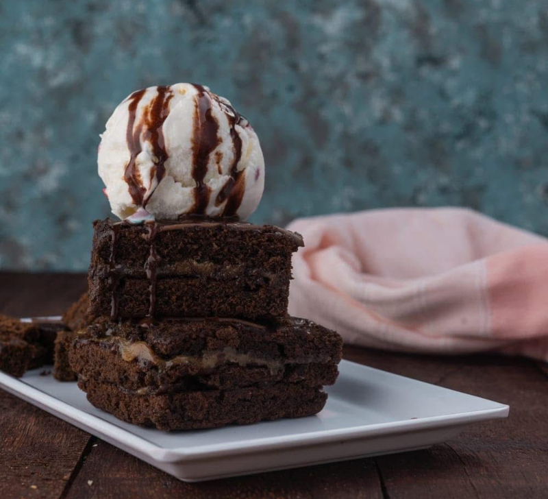 Para los amantes del chocolate: brownie con 2 porciones de helado a elección, 1 topping de tu preferencia, 1 salsa y barquillo pequeño.
