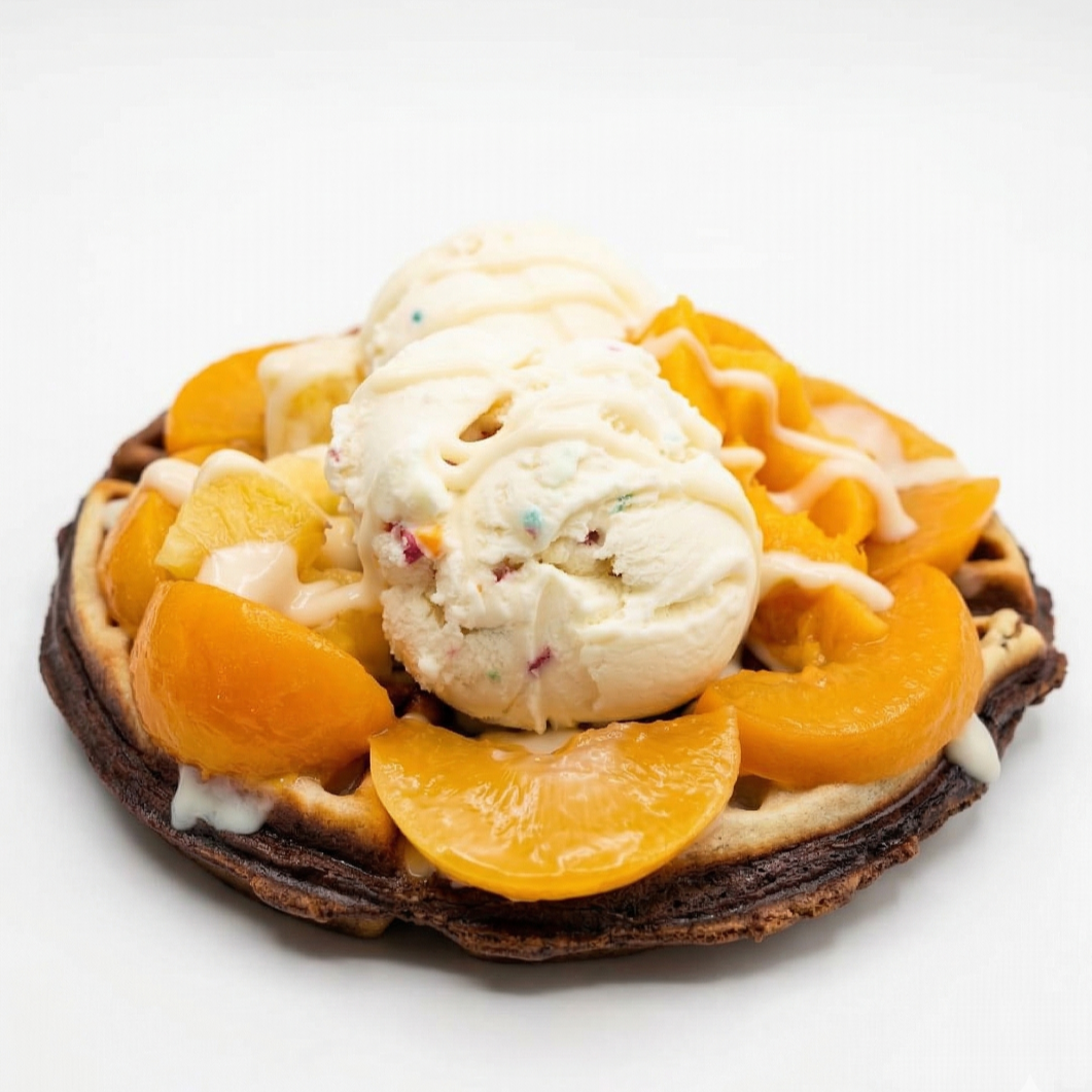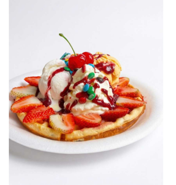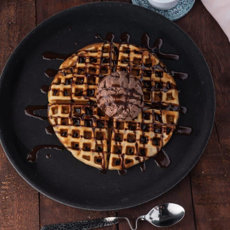 Waffle completo con 1 salsa de tu preferencia y dos porciones de helado a elección.
