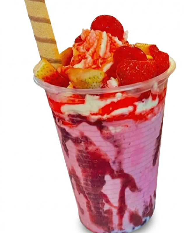 Explosión frutal con 2 porciones de helado a tu elección, fresas, cerezas, frutos rojos, 1 salsa, chantilly y 2 barquillos grandes.