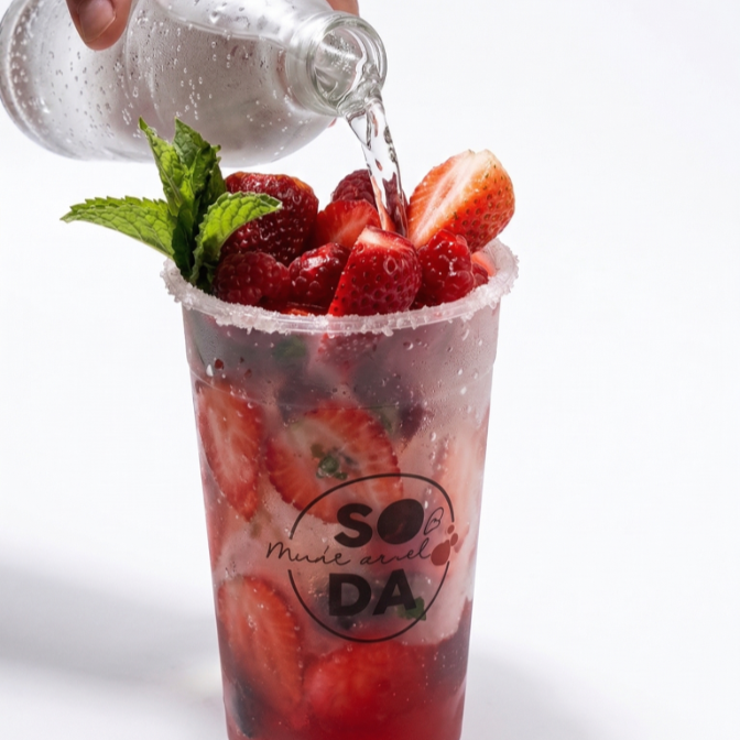 Refrescante soda de 16 oz con borde michelado, sabor a tu elección y trozos de fruta natural. ¡La combinación perfecta de frescura y sabor!