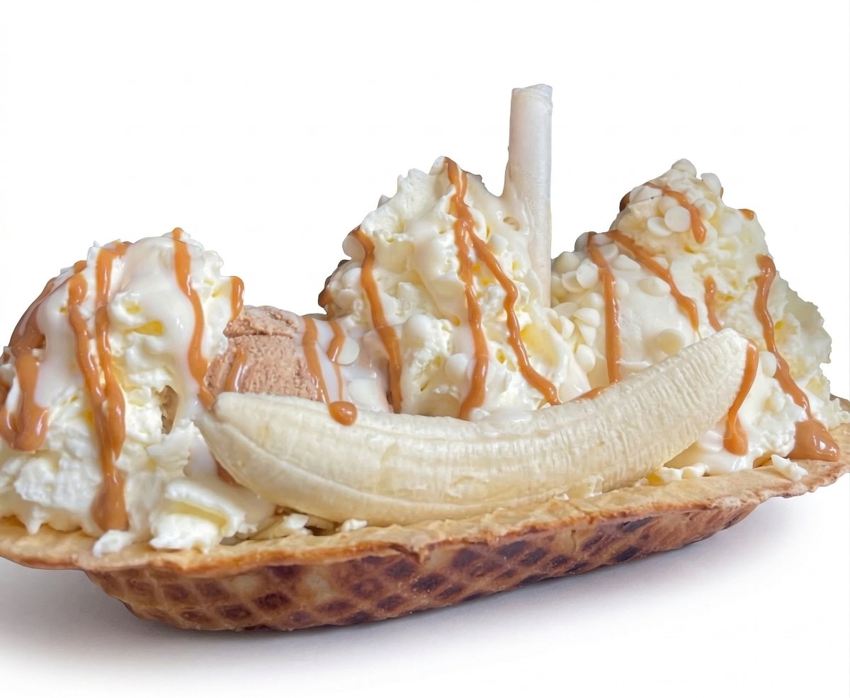 Banano fresco, queso, 2 porciones de helado elección, chantilly, 1 topping a elección, 1 salsa a elección y barquillo en empaque comestible.