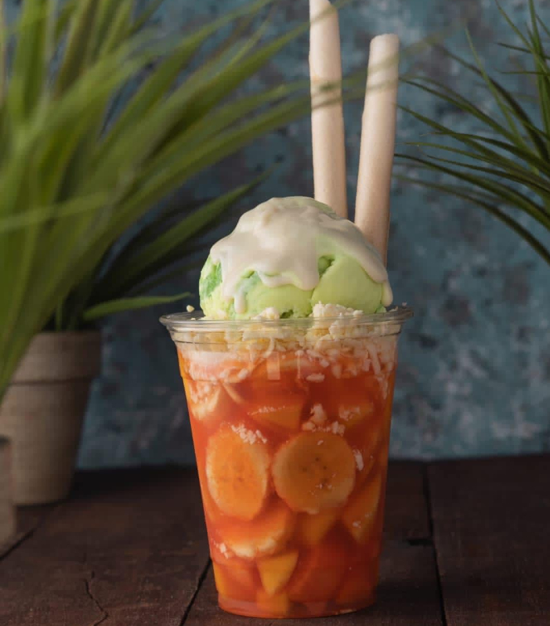 Delicioso salpicón de 13 oz acompañado de 1 porción de helado a elección, 1 salsa y 2 barquillos grandes.
