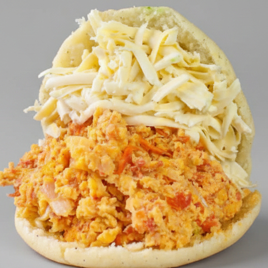 Rica arepa rellena de mantequilla con perico de huevo y Queso mozzarella
