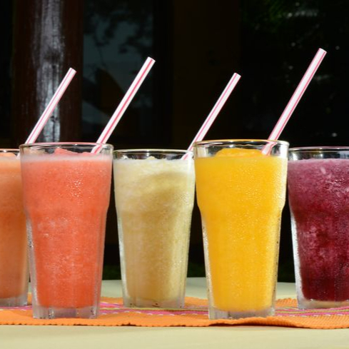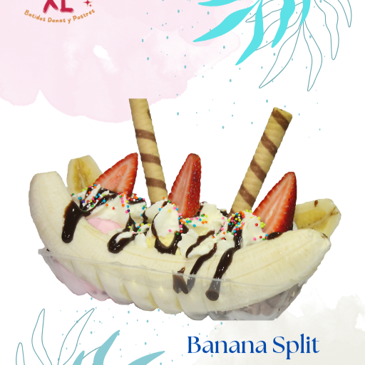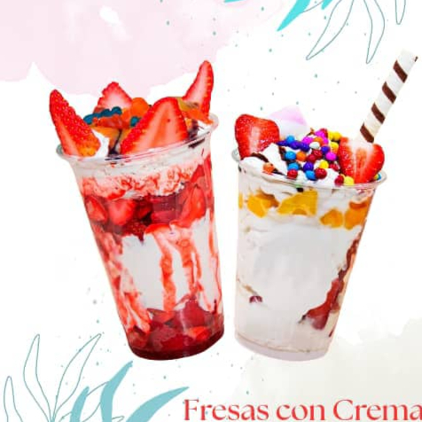 Fresas, banano, crema de la casa, almíbar de fresa, barquillo, leche en polvo, 1 topping, todo en un vaso de 9oz.