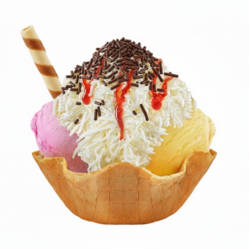 Una Ricura con 3 Bolas de Helado, Banano, Chantilly, Barquillo, gotas de colores cereza y salsa