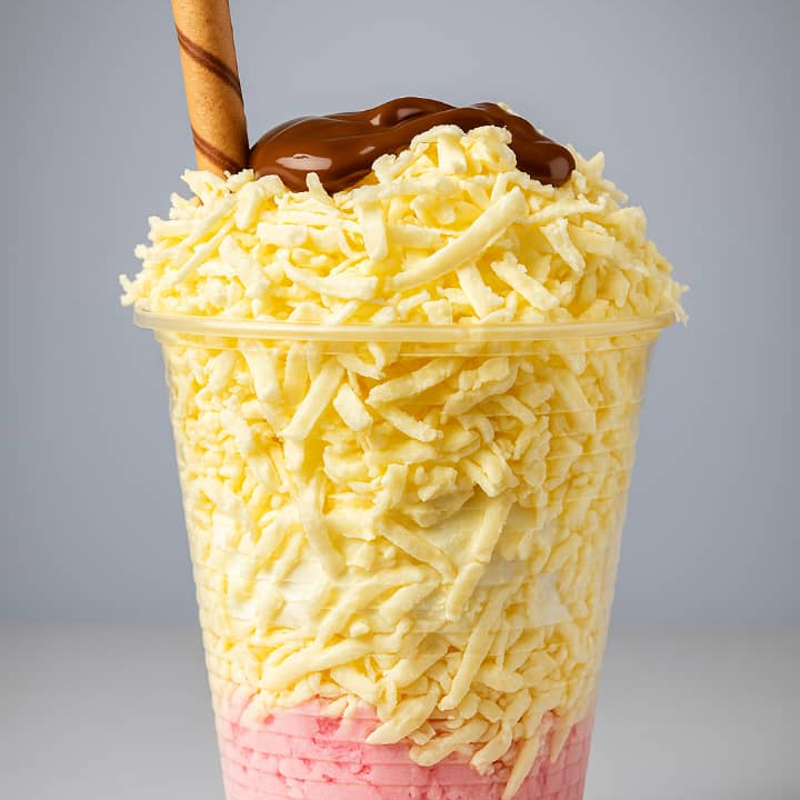 Crujiente Galleta en forma de concha rellena de 2 bolas de helado de tu elección con queso lluvia de chocolate, banquillo y salsa
