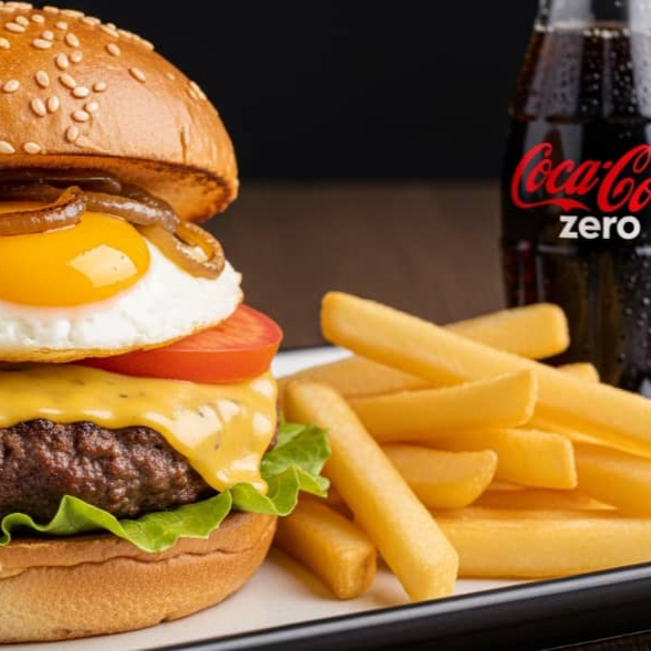 rica hamburguesa con 100gr de carne, un Huevo frito,queso cheddar, tomate, lechuga, cebolla caramelizada, acompañada de papas fritas y una cocacola zero de 250 ml