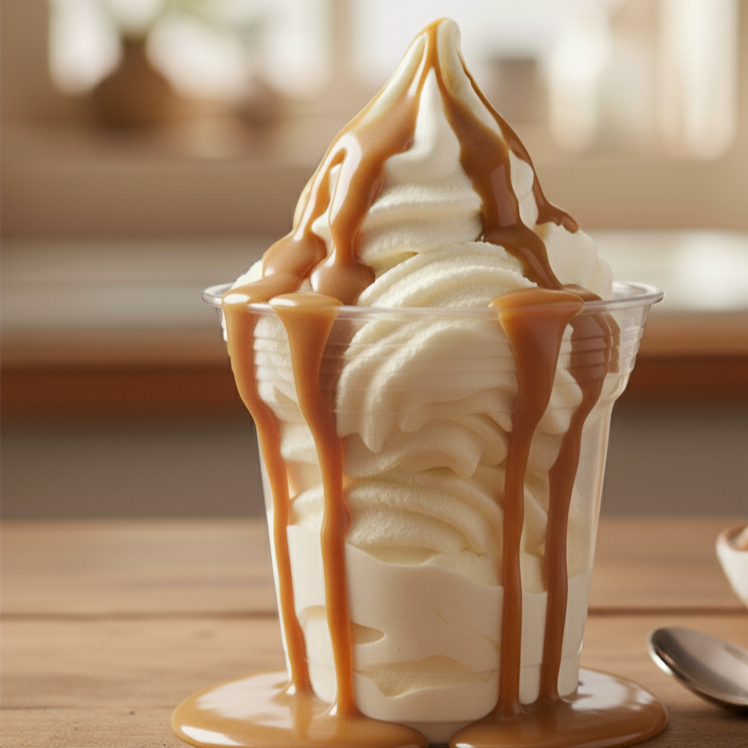 Helado de vainilla con capas de salsa de Arequipe en un vaso de 12 oz