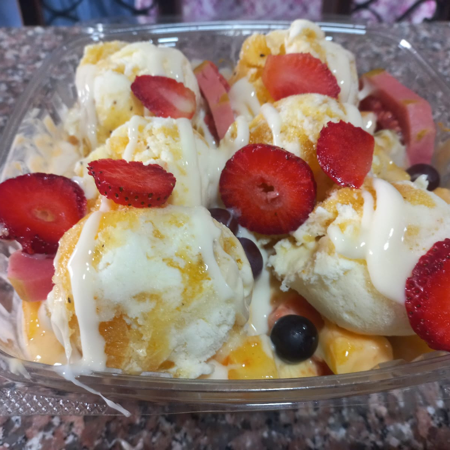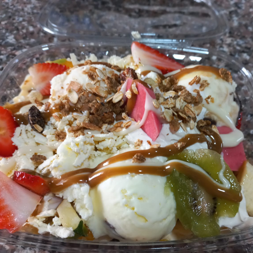 Para 1 a 2 Personas, Variedad de Frutas, Elige 3 Helados, incluye queso, chantilly, salsas, topin. Para detalle elige mono y nota