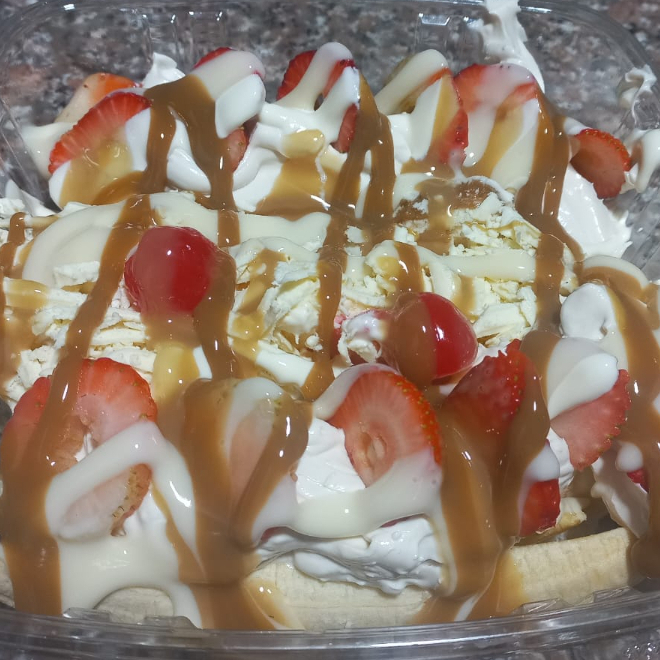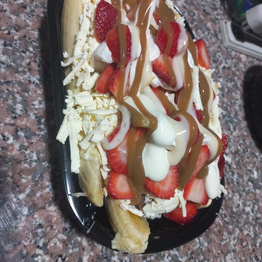 Para 2 Personas, Banano, elige 4 helados, Chantilly, Queso, Fresas, cr. De leche, salsas y topping. Para detalle Adiciona mono Mensaje.