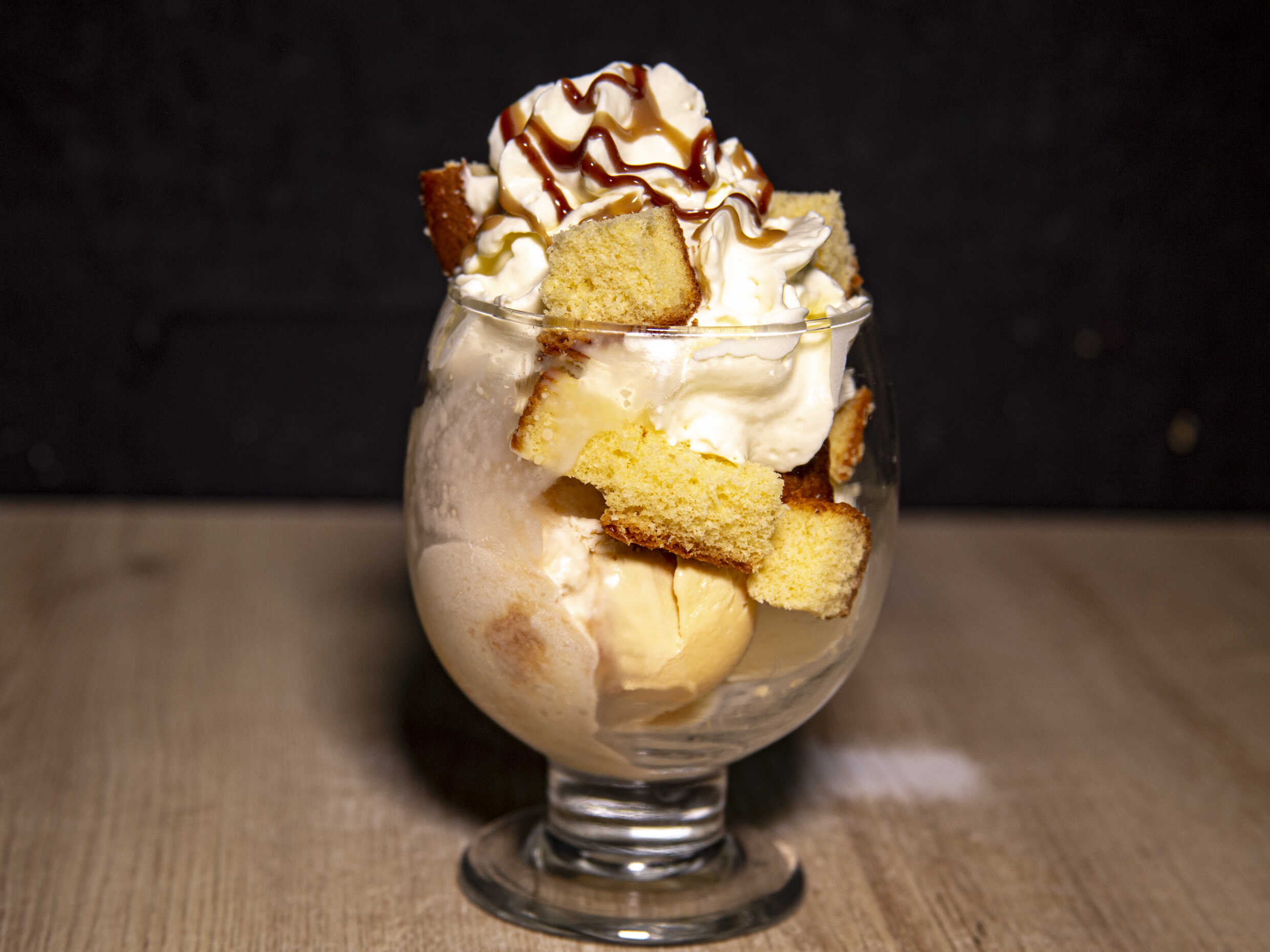 Helado, chantilly, perlas explosivas y salsa de chocolate.