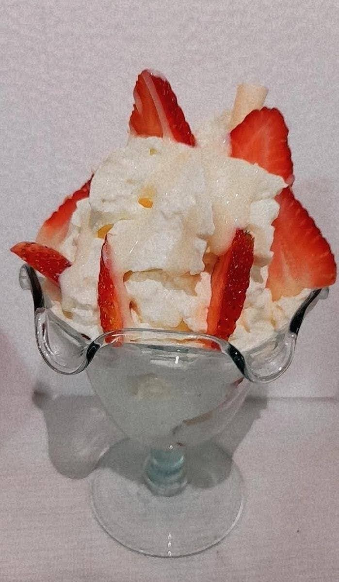 Suspiros, fresa, melocoton, barquillos, helado y chantilly.
