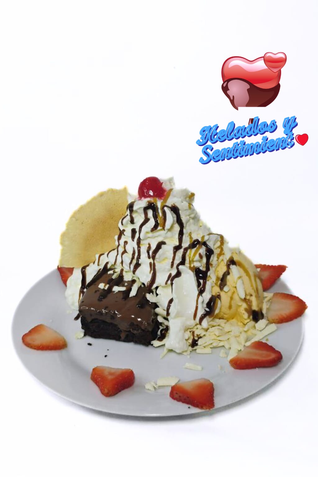 Helado, variedad de frutas, chantilly, queso, salsas y barquillo.