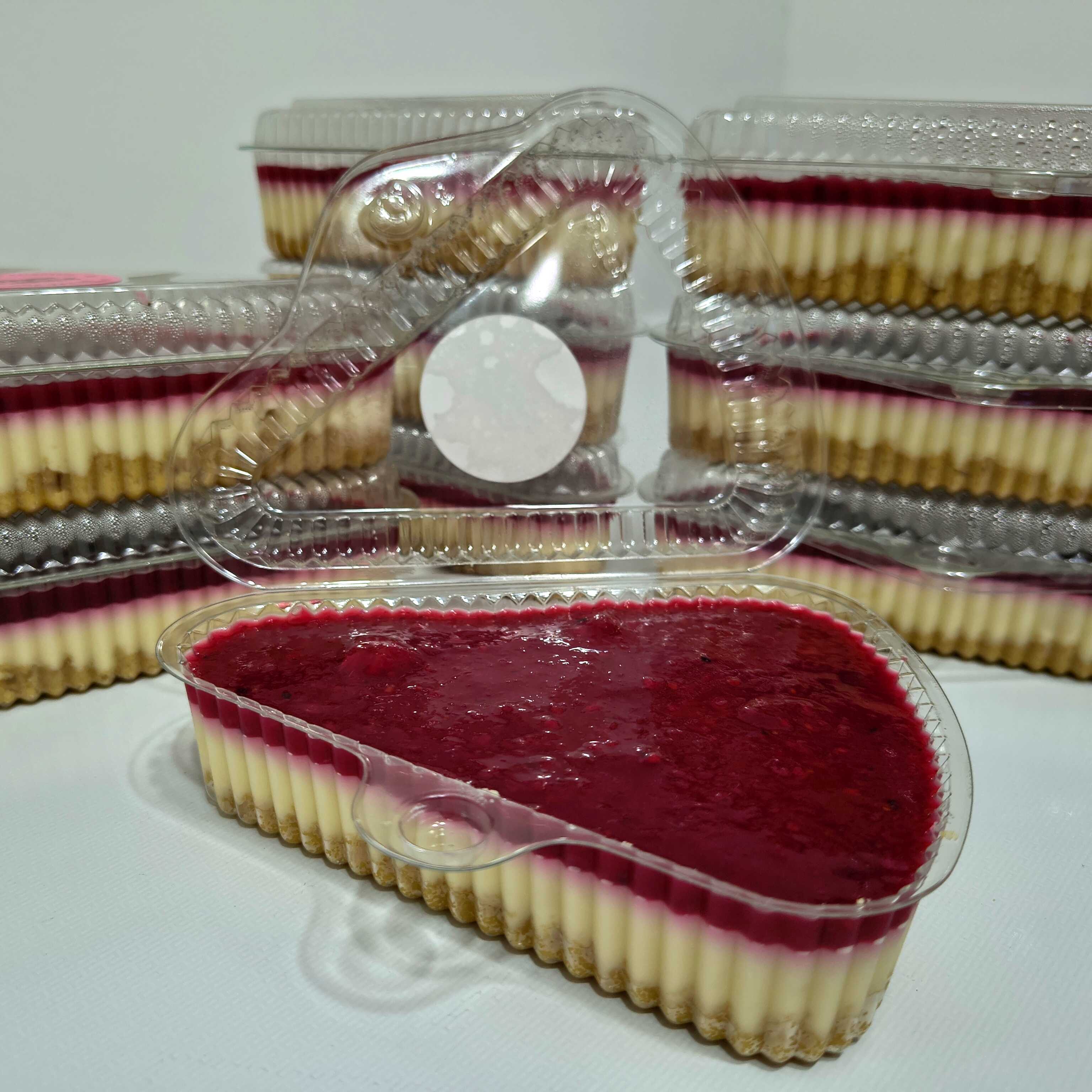 Delicioso postre personal con una base de galleta triturada más mantequilla seguida de una mezcla de queso crema, leche condensada, crema de leche, vainilla y en la superficie un delicioso dulce de frutos rojos.